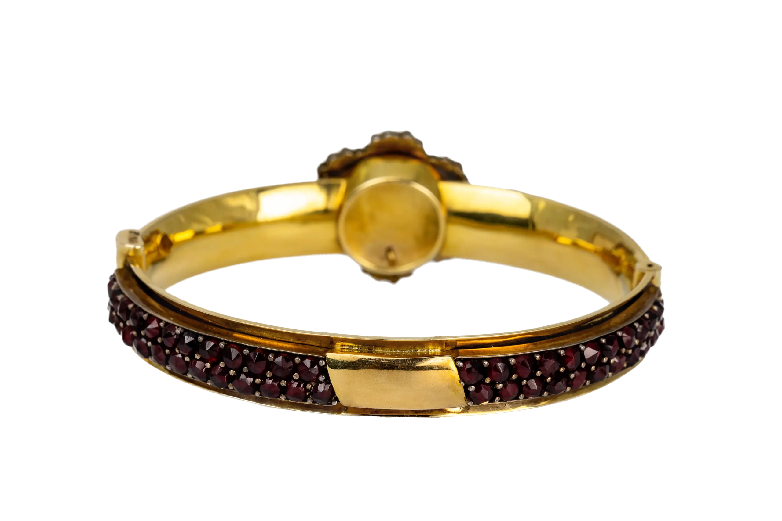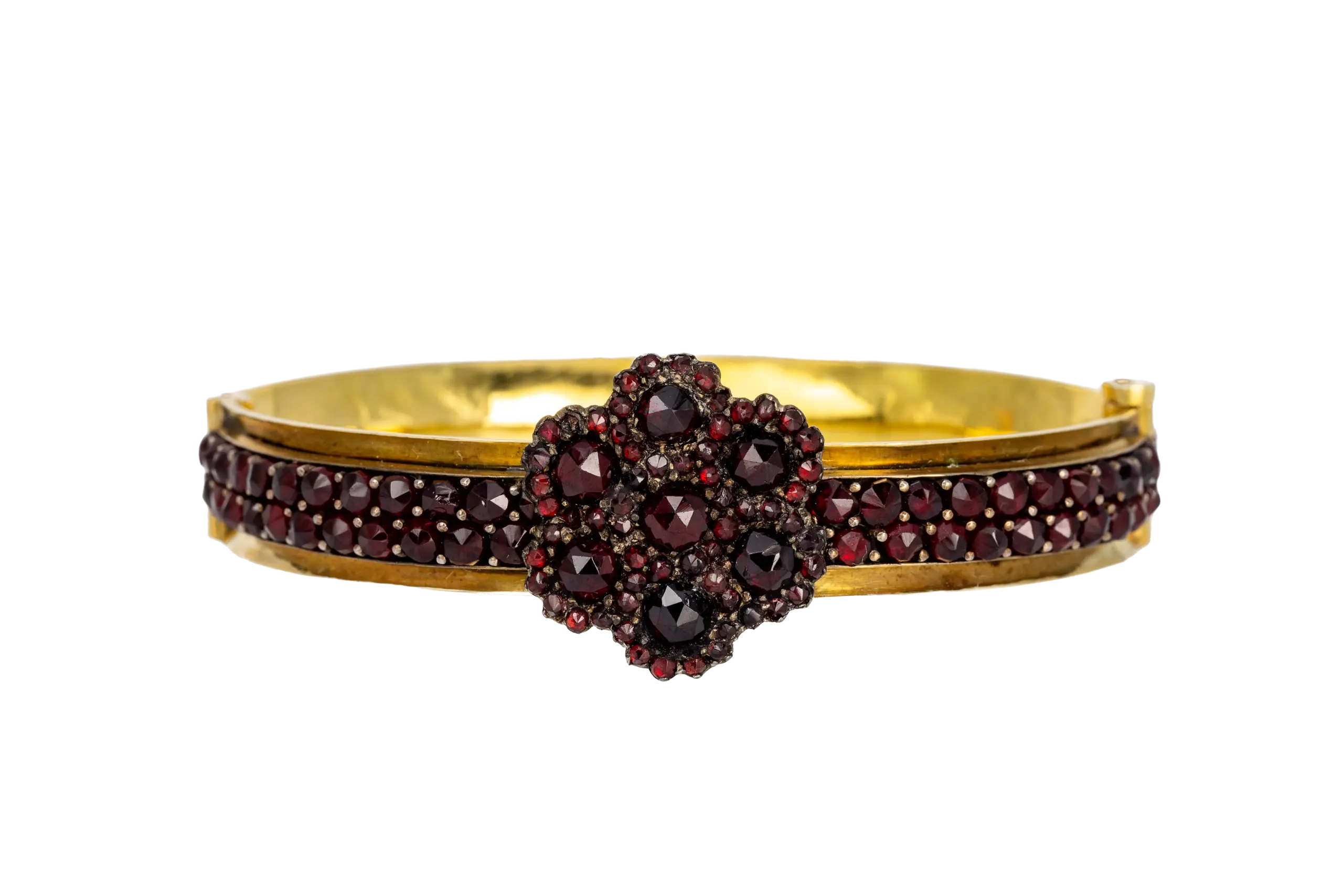Bohemian garnets, sourced primarily from what is now the Czech Republic, were highly prized during the 19th century for their striking crimson hue and exceptional clarity. A type of pyrope garnet, these gemstones were synonymous with passion, love, and vitality, making them a popular choice in sentimental jewellery of the Victorian period. The garnets in this bangle are meticulously arranged to form a flower, enhancing their brilliance and drawing attention to their fiery tones. This technique of clustering or pavé setting was a hallmark of Victorian jewellery, allowing the stones to sparkle in unison while showcasing the skill of the jeweller.