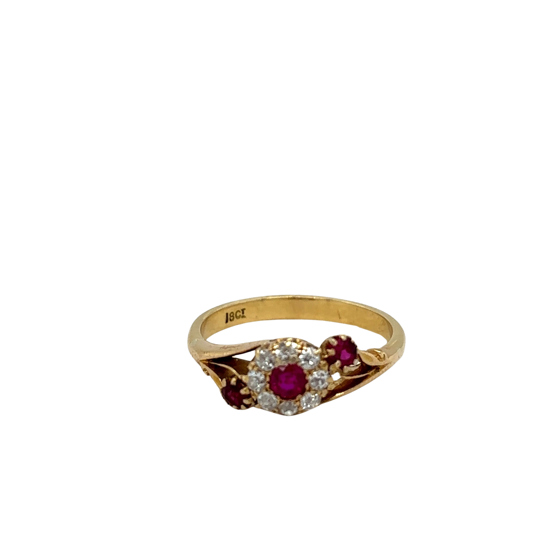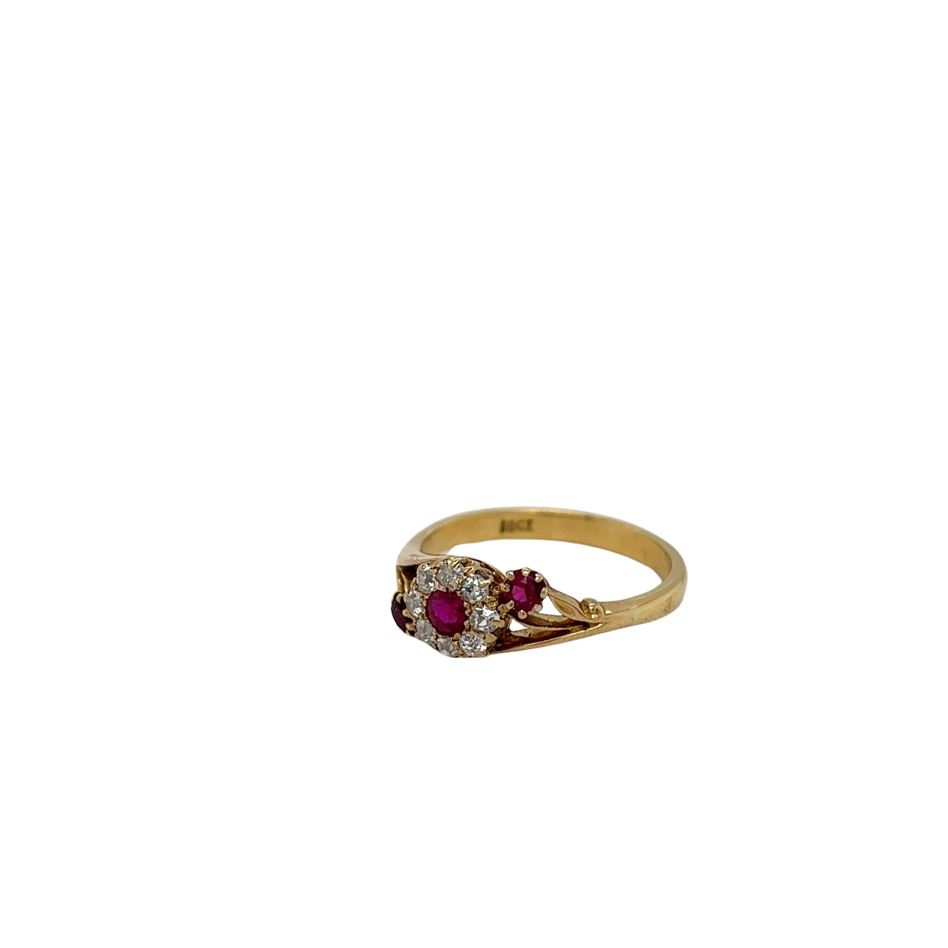 The beautiful handmade Victorian 18ct Yellow Gold Ruby and Diamond Cluster Ring with floral scroll shoulders is a dainty beautiful piece that you should come and try on today!
