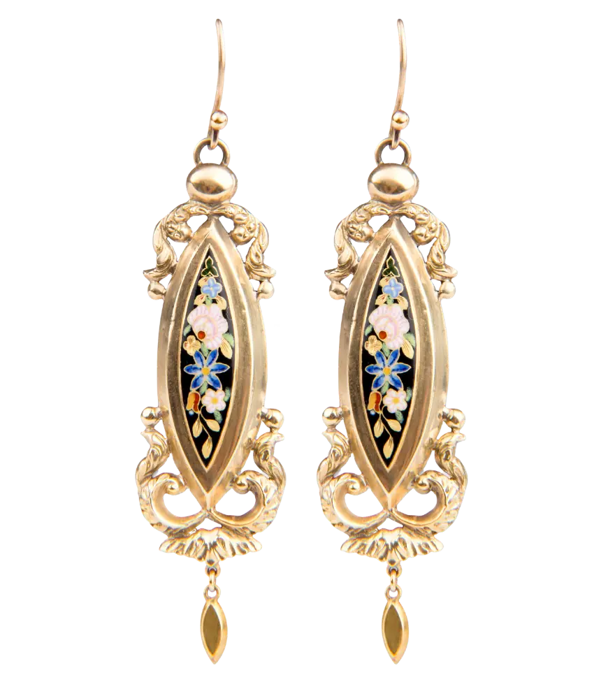 Amazing and Unique Victorian 18ct Yellow gold Enamel floral pattern Drop Earrings circa 1890