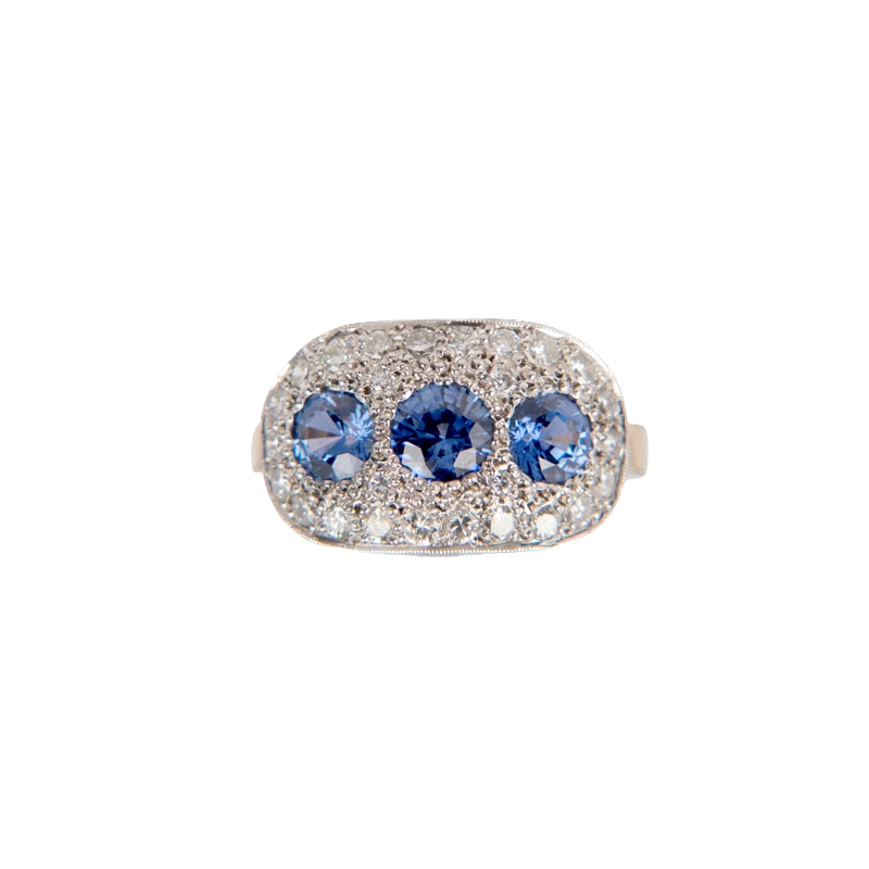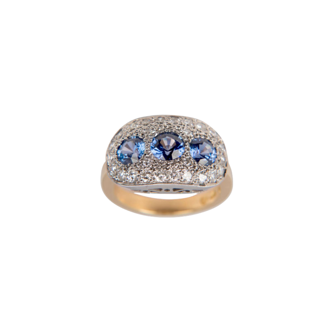 Handmade 18ct White and Yellow Gold Triple Round Ceylonese Sapphire and Diamond Cluster Ring.