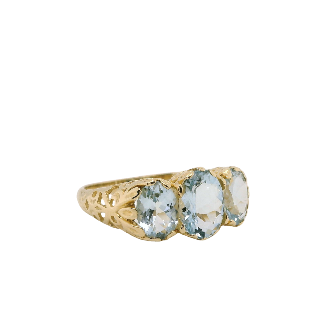 Our beautiful 9ct Yellow Gold 3 Graduated Oval Aquamarine Ring with Filligree designs is a show stopping piece you should add to your collection today!