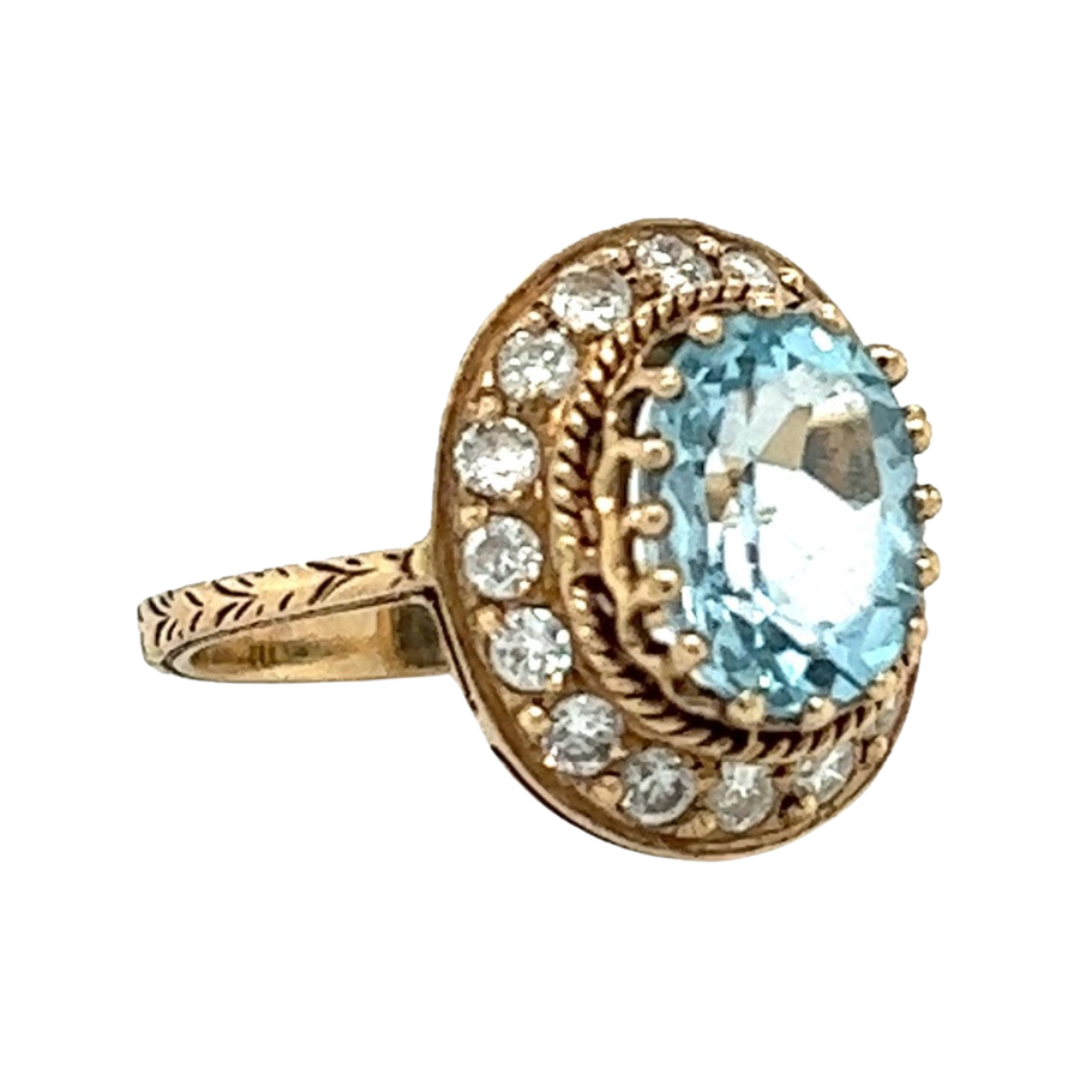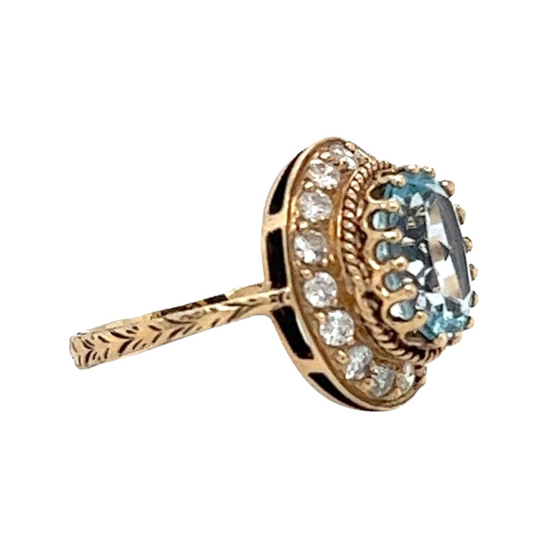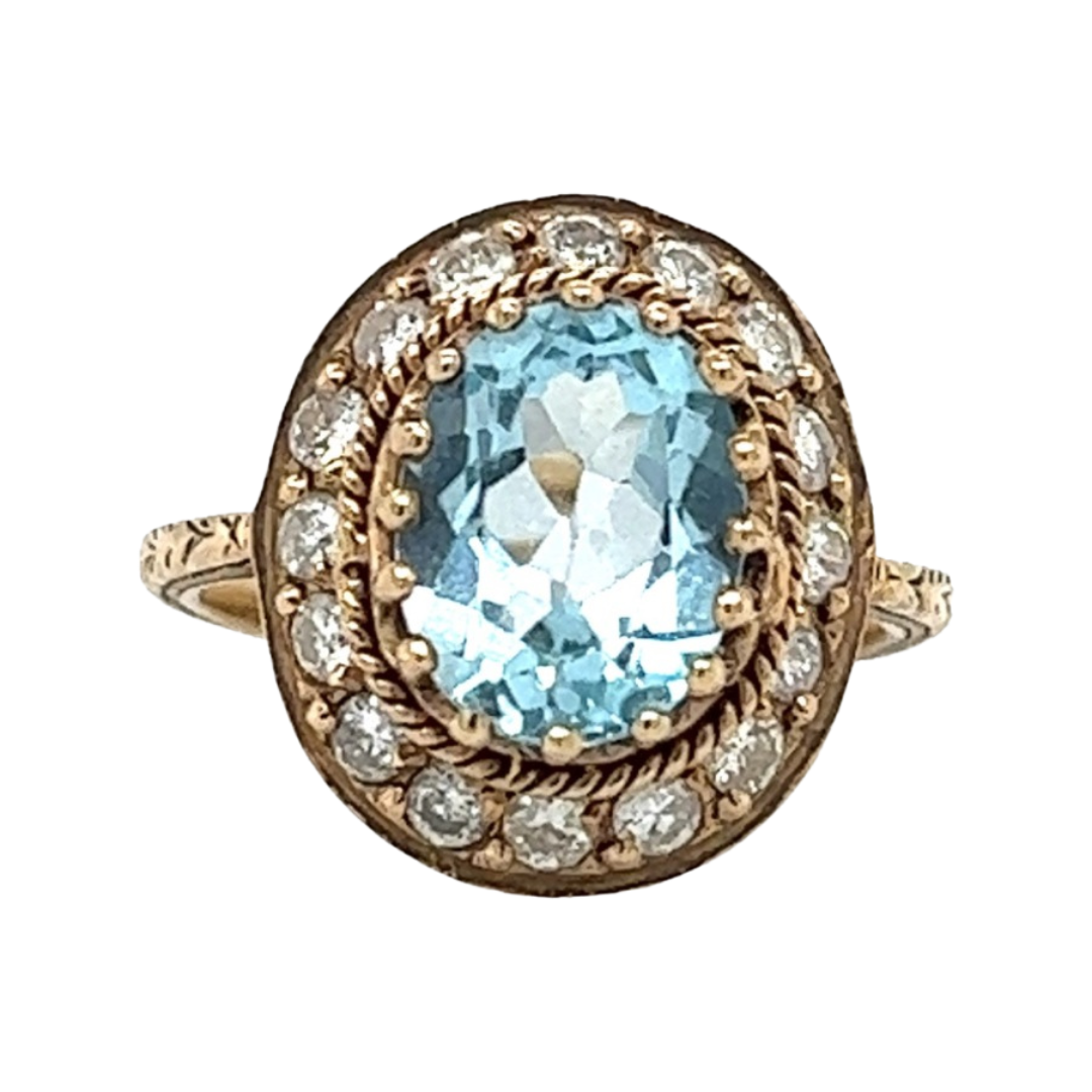 9ct YG oval Blue Topaz in a crown style claw setting with Diamond Halo surround and engraved band Ring