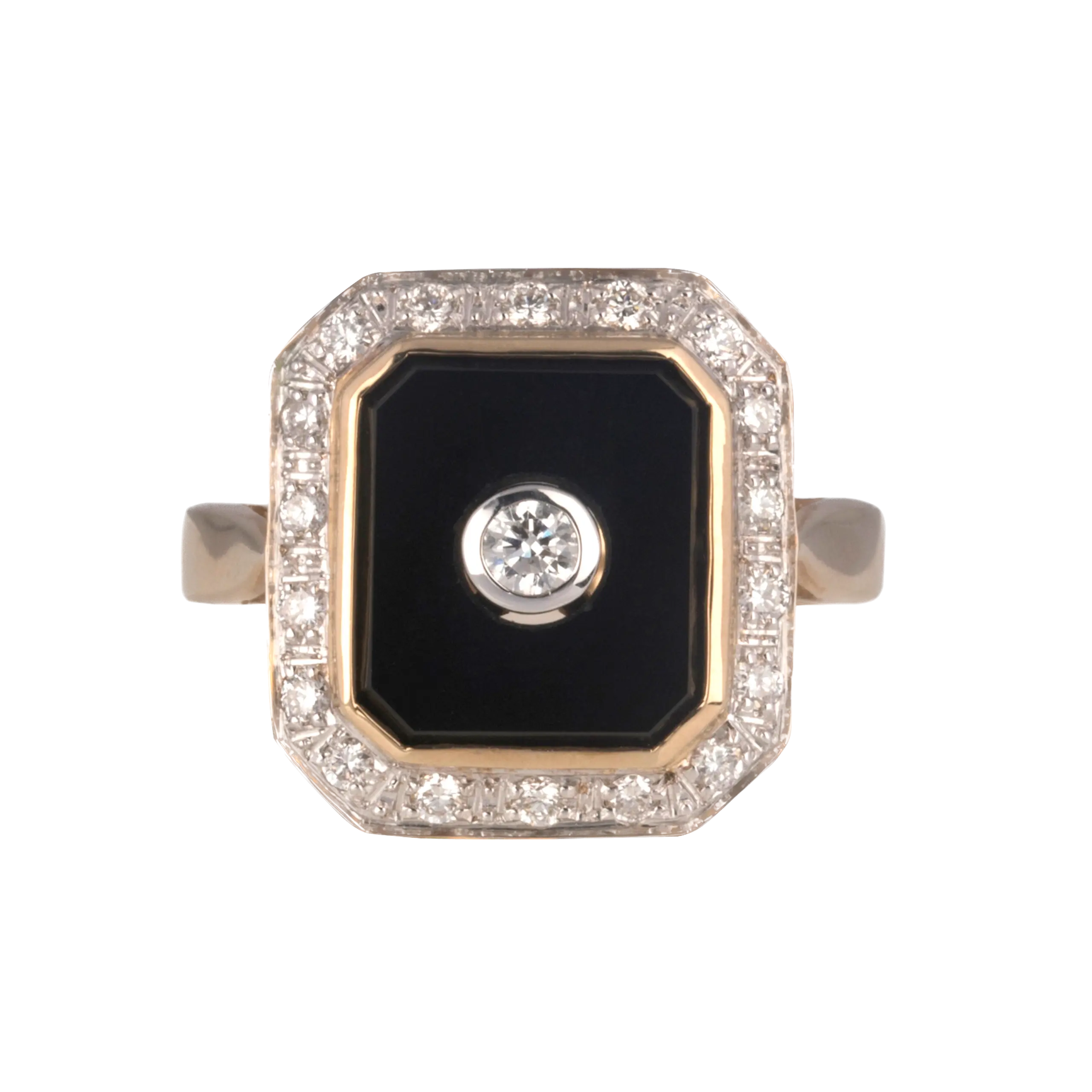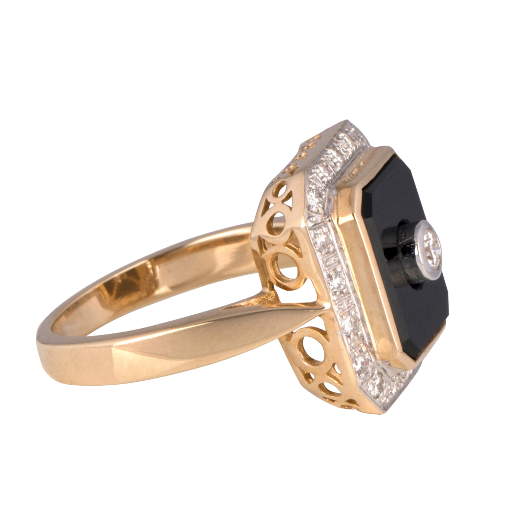 9ct Rose Gold Emerald Cut Onyx & Diamond Ring in Art Deco style.