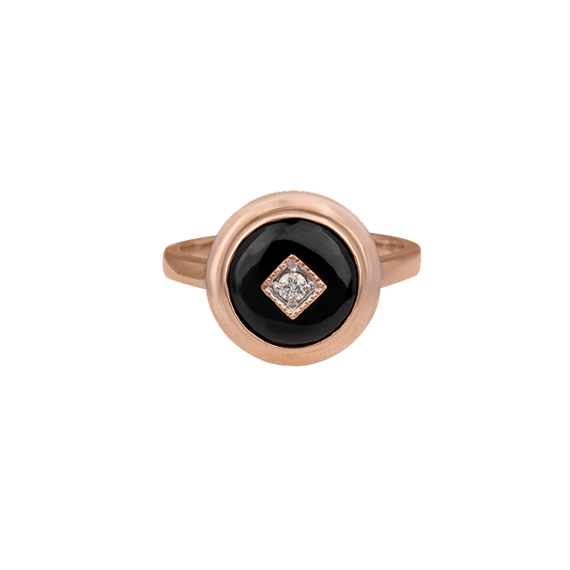 9ct Rose Gold Onyx & Diamond Round Double Bezel Art Deco Style Ring