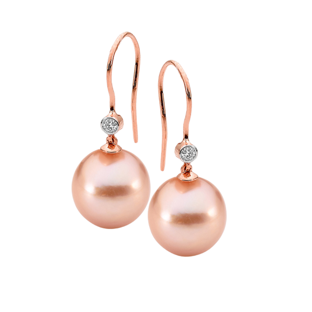 9ct Rose Gold Pink Round 10-11mm Fresh Water Pearl Shepherd Hook Earrings with Diamonds