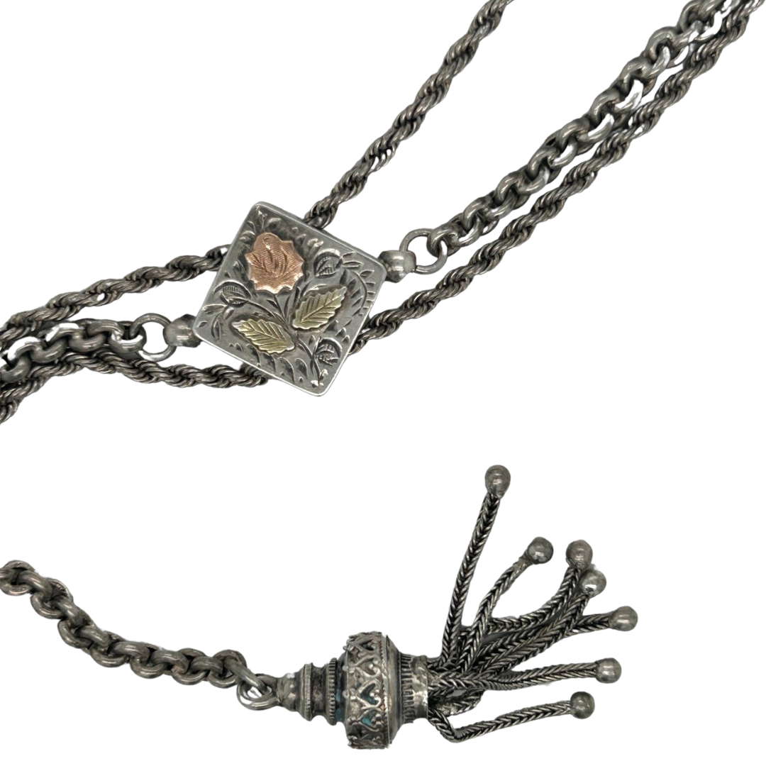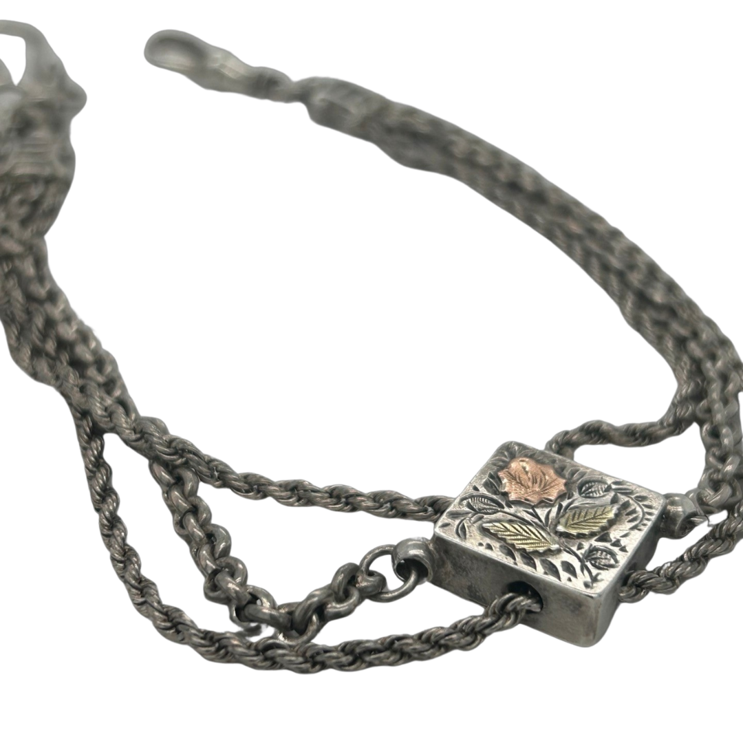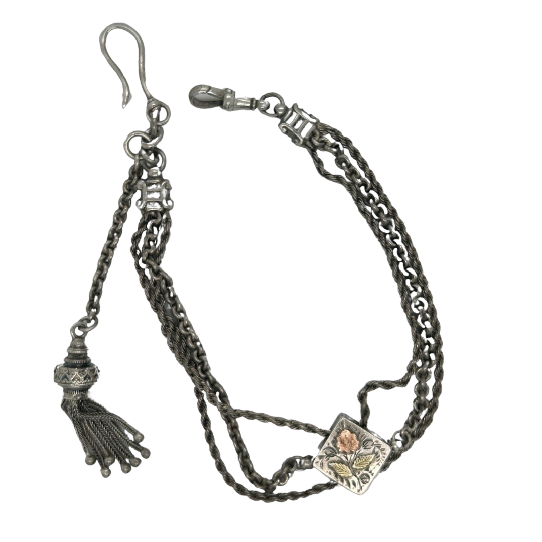 The timeless Victorian Sterling Silver Albertina 3 Strands with Tassel and Applied Gold Pattern Disc can be worn many ways as a bracelet or added to another albertina to make a necklace, come and view it in store today!