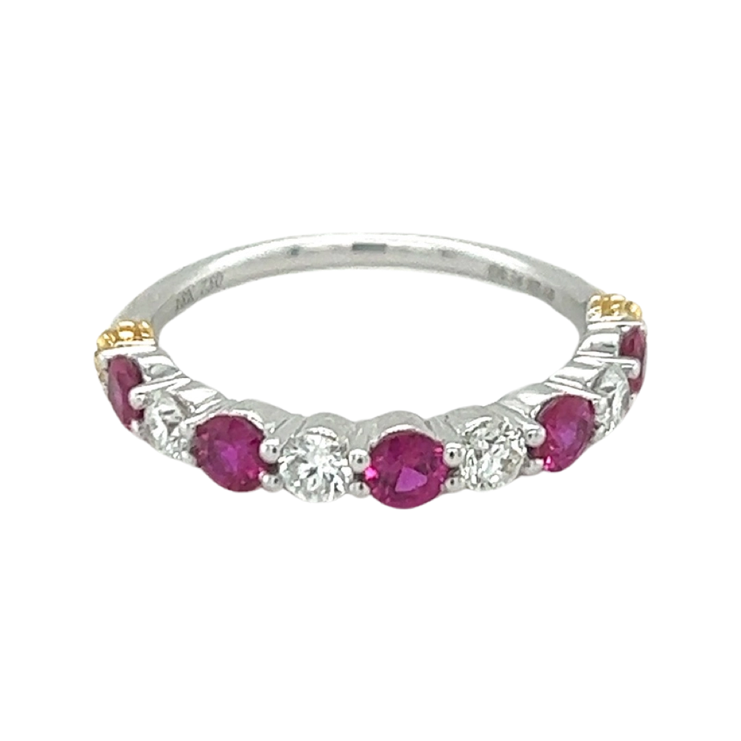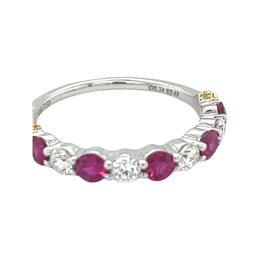 The stunning yet simple 18ct White Gold Alternating Brilliant Cut Ruby and Diamond Claw Set Band has Gold Accents and would make a beautiful wedding band.