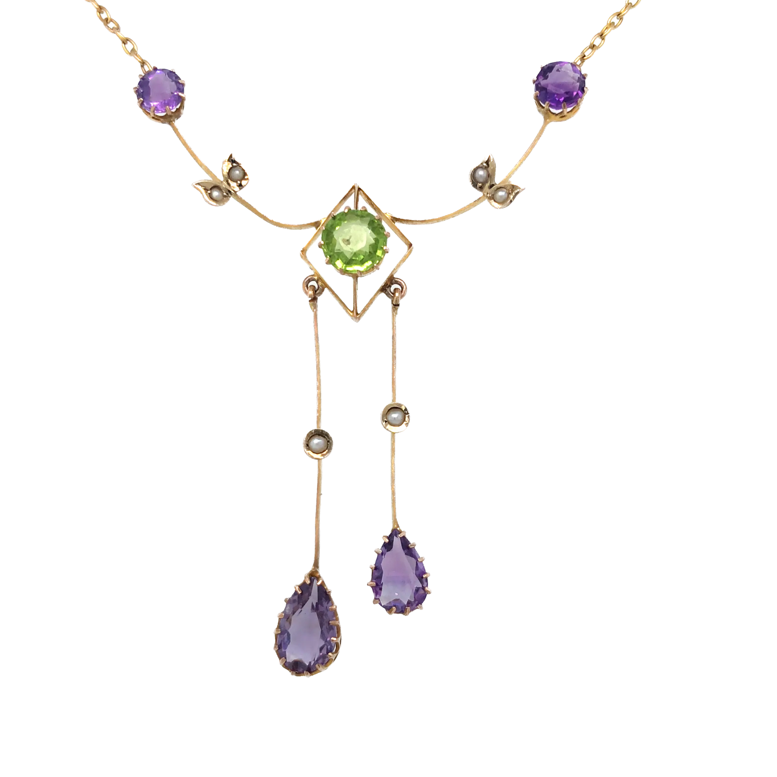 Australian 9ct Yellow Gold, Amethyst & Peridot Suffragette Necklace By Willis.