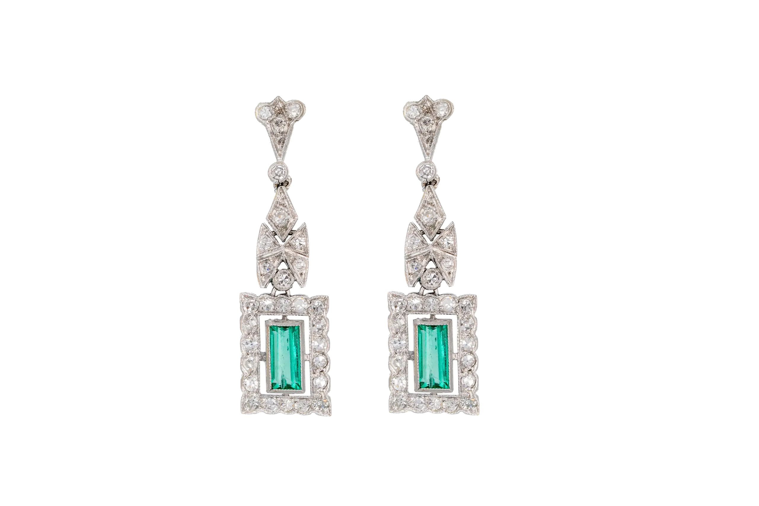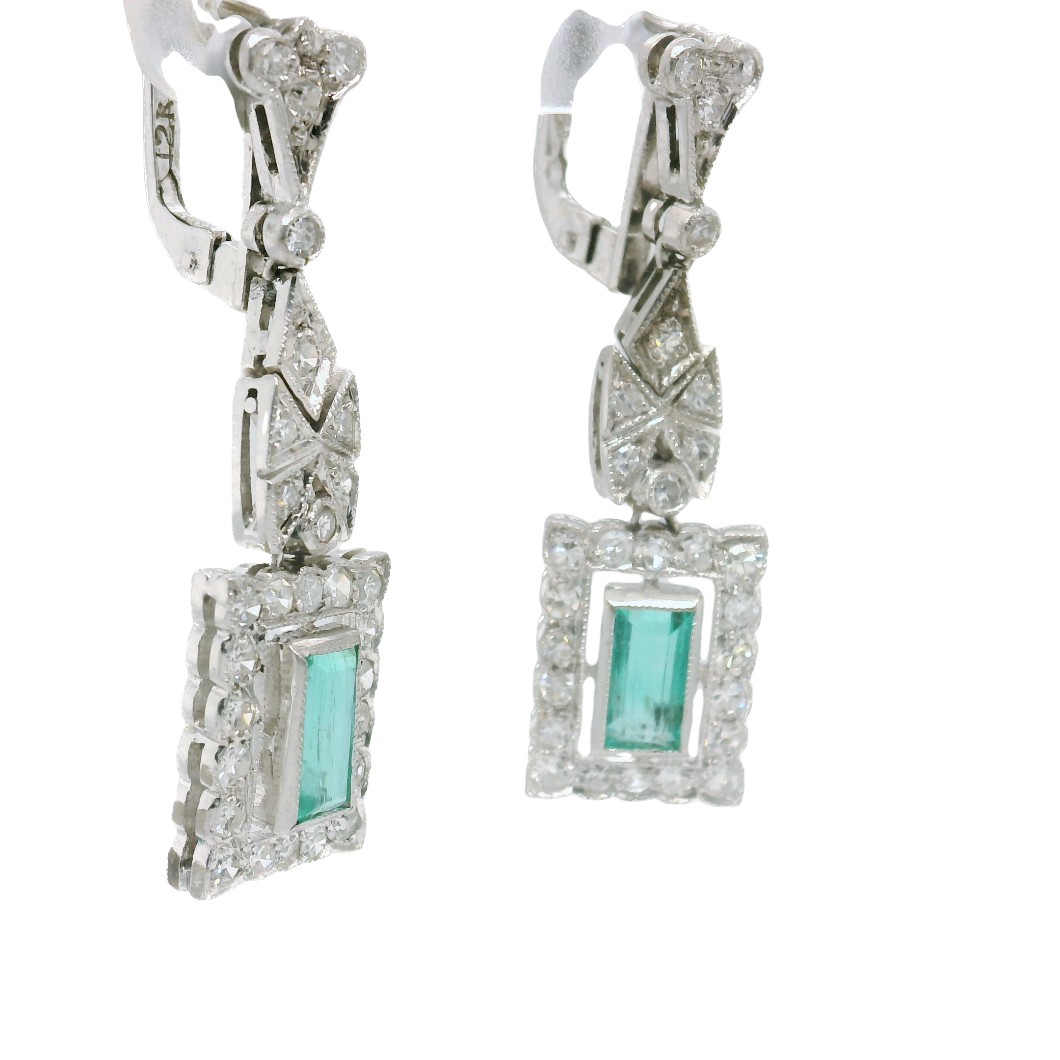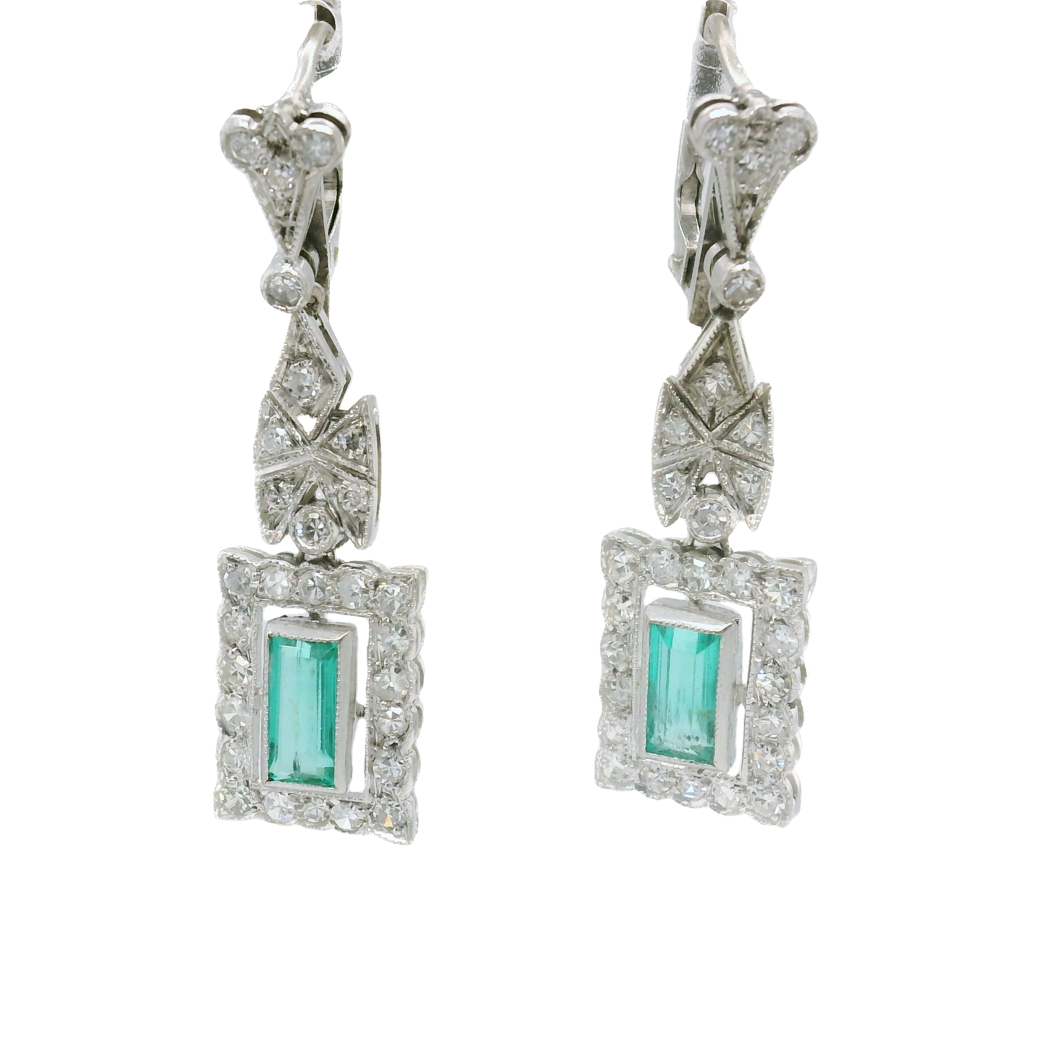 These exquisite Art Deco handmade 18ct white gold emerald and diamond drop earrings are a stunning reflection of the iconic design movement that flourished in the 1920s and 1930s. Characterised by geometric shapes, bold colors, and luxurious materials, the Art Deco era was a time of artistic innovation and cultural change. These earrings embody the essence of this period, featuring clean lines and a striking balance between elegance and modernity.