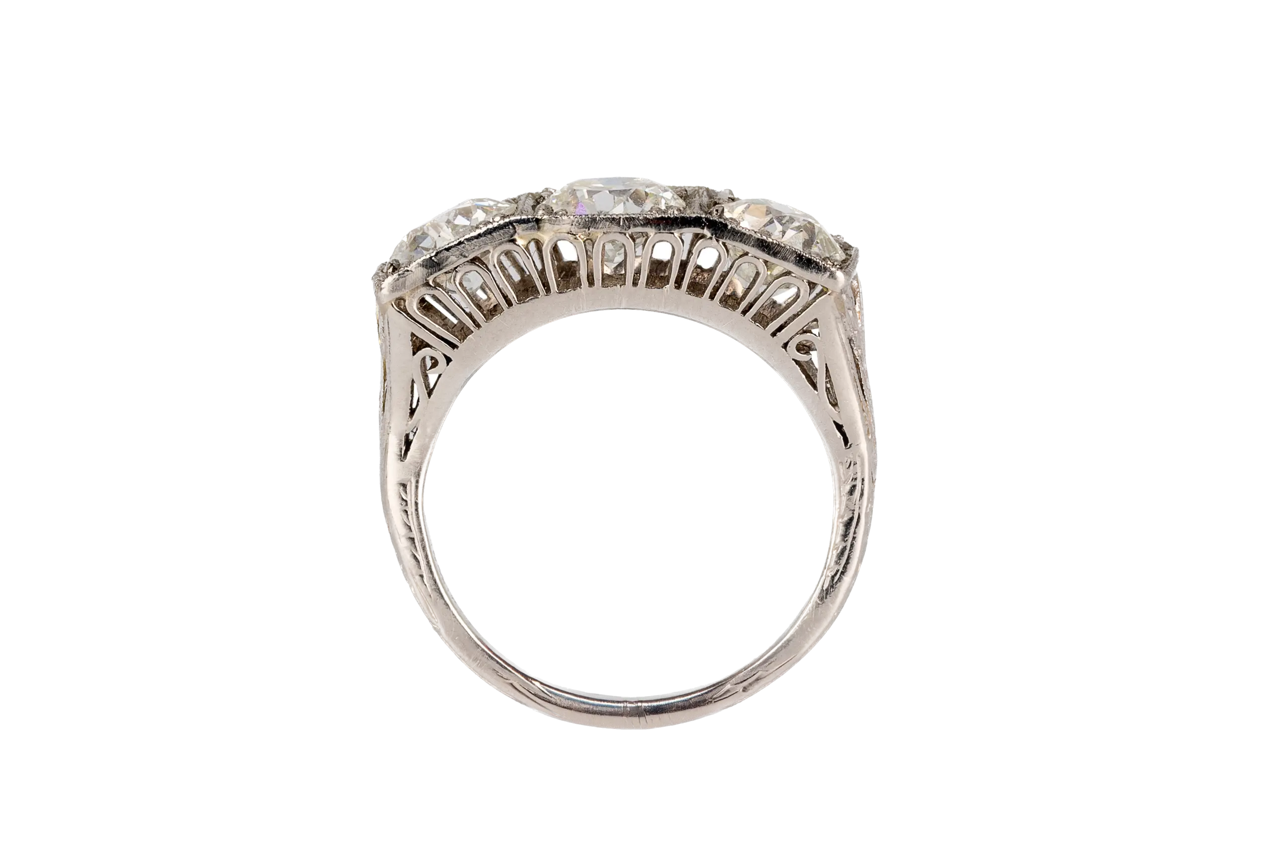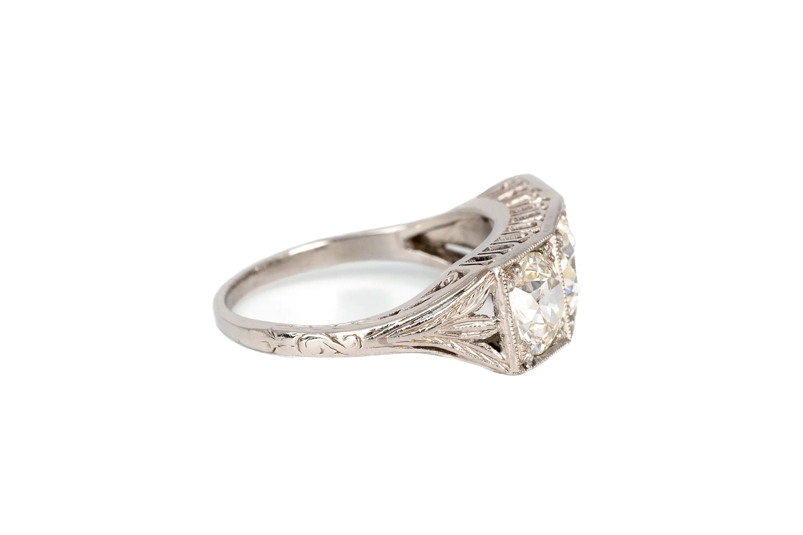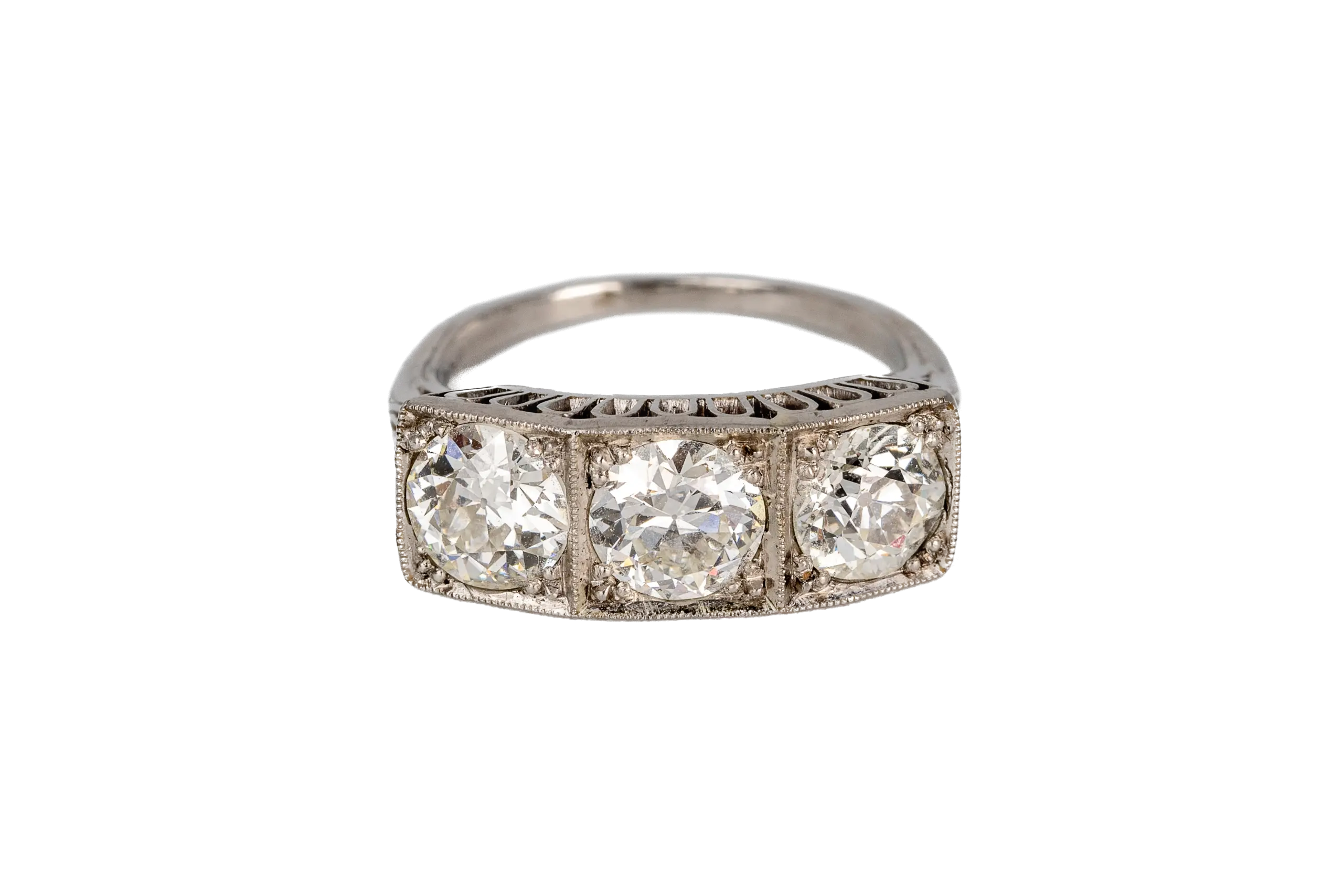 Beautiful and just stunning Art Deco Handmade Platinum 3 x Early European Cut Diamonds, triple claw set in a square frame and mill grain detailing.There are intricate scalloped wire designs along the sides of the settings. The shoulders are raised and split into three. The shoulder frame features detailed floral hand engraving.