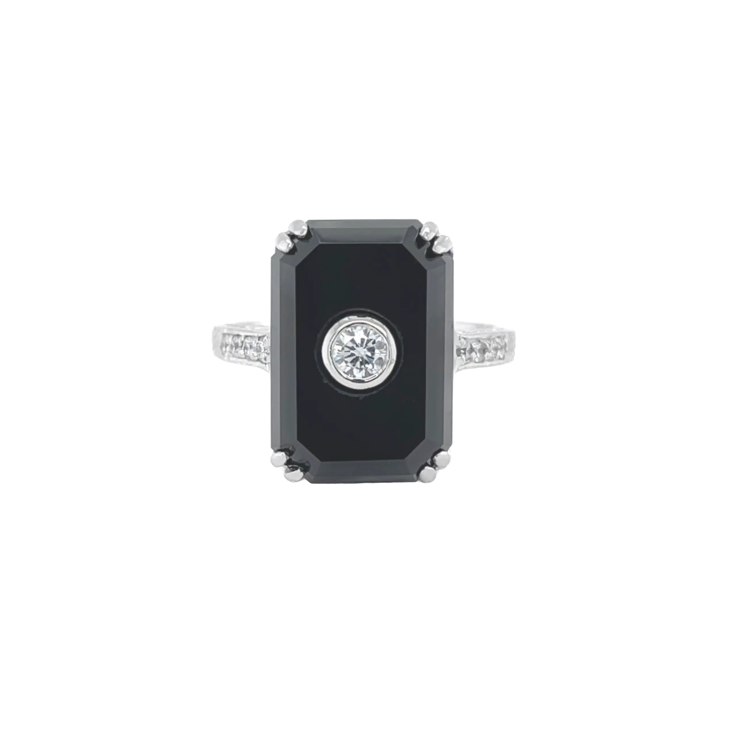 Art Deco Style 9ct White Gold Ring With Emerald Cut Buff Top Onyx & Diamonds