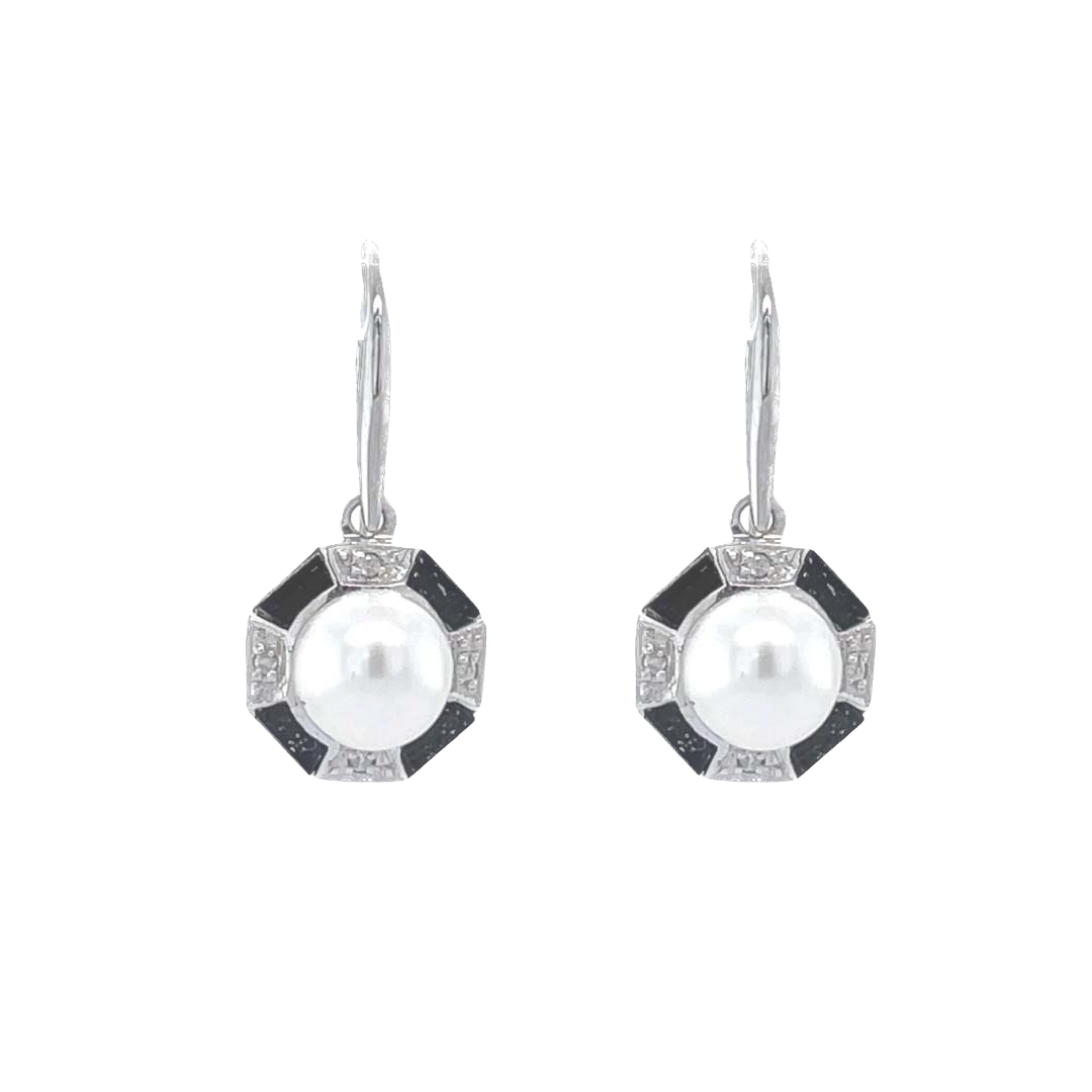 The uniquely beautiful 9ct White Gold Art Deco Style Pearl Surrounded by Onyx & Diamond Earrings would make any outfit pop.