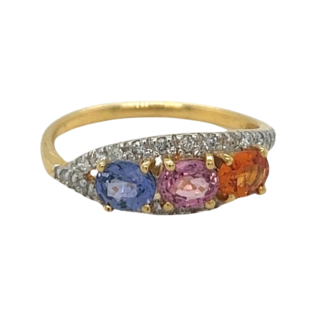 Our Beautiful and precious 18ct Yellow Gold Blue, Pink, and Orange Sapphire and Diamond Ring would make a exquisite ring for your collection.