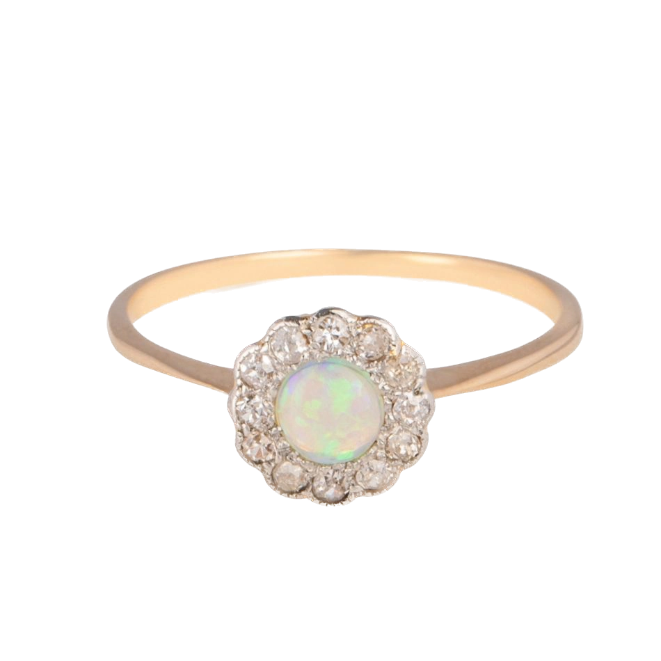 Edwardian 18ct Yellow Gold Opal & Diamond Daisy Cluster Ring