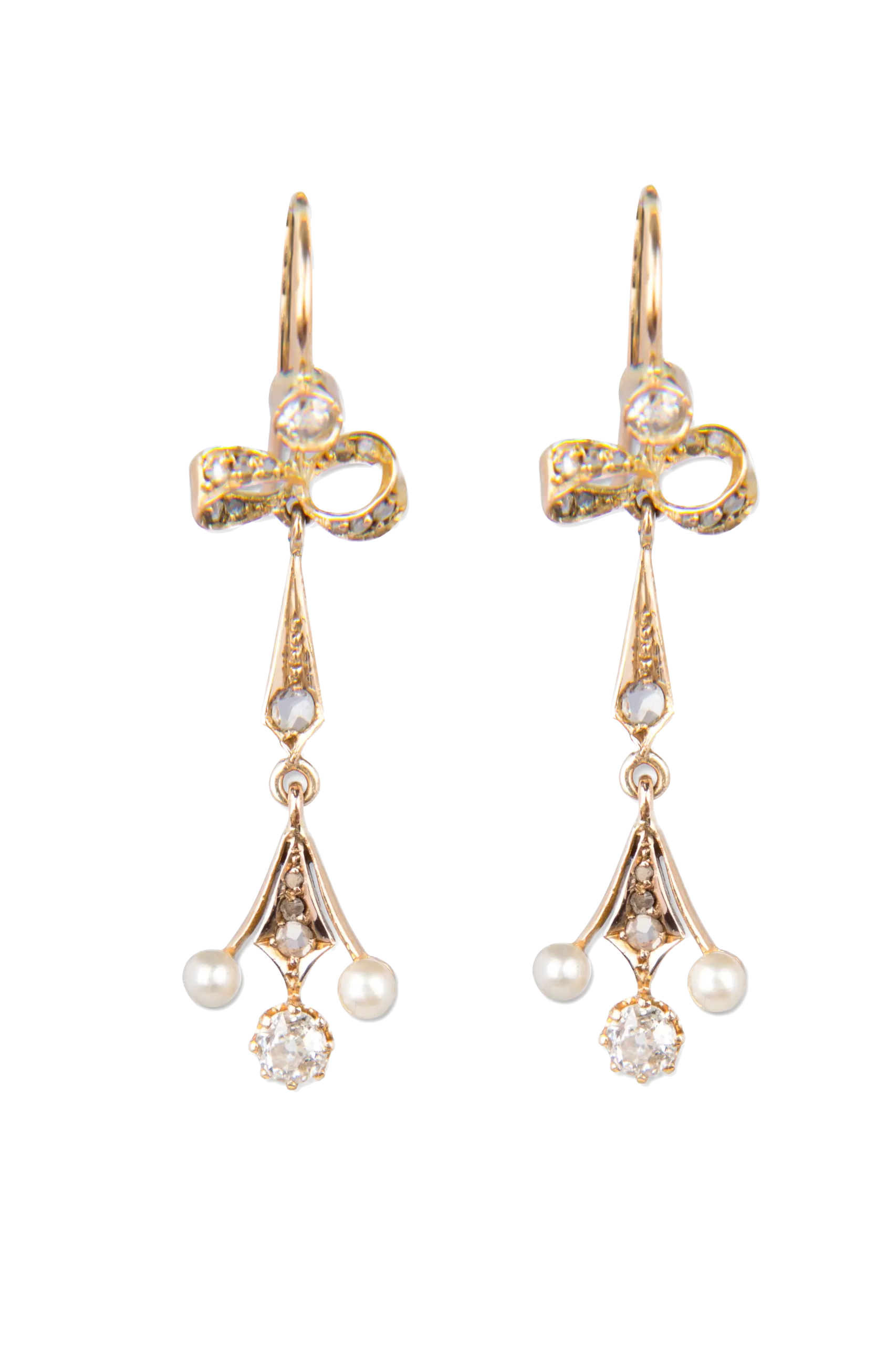 Edwardian antique 18ct Yellow Gold Pearl & Diamond Drop Earrings with bows on top