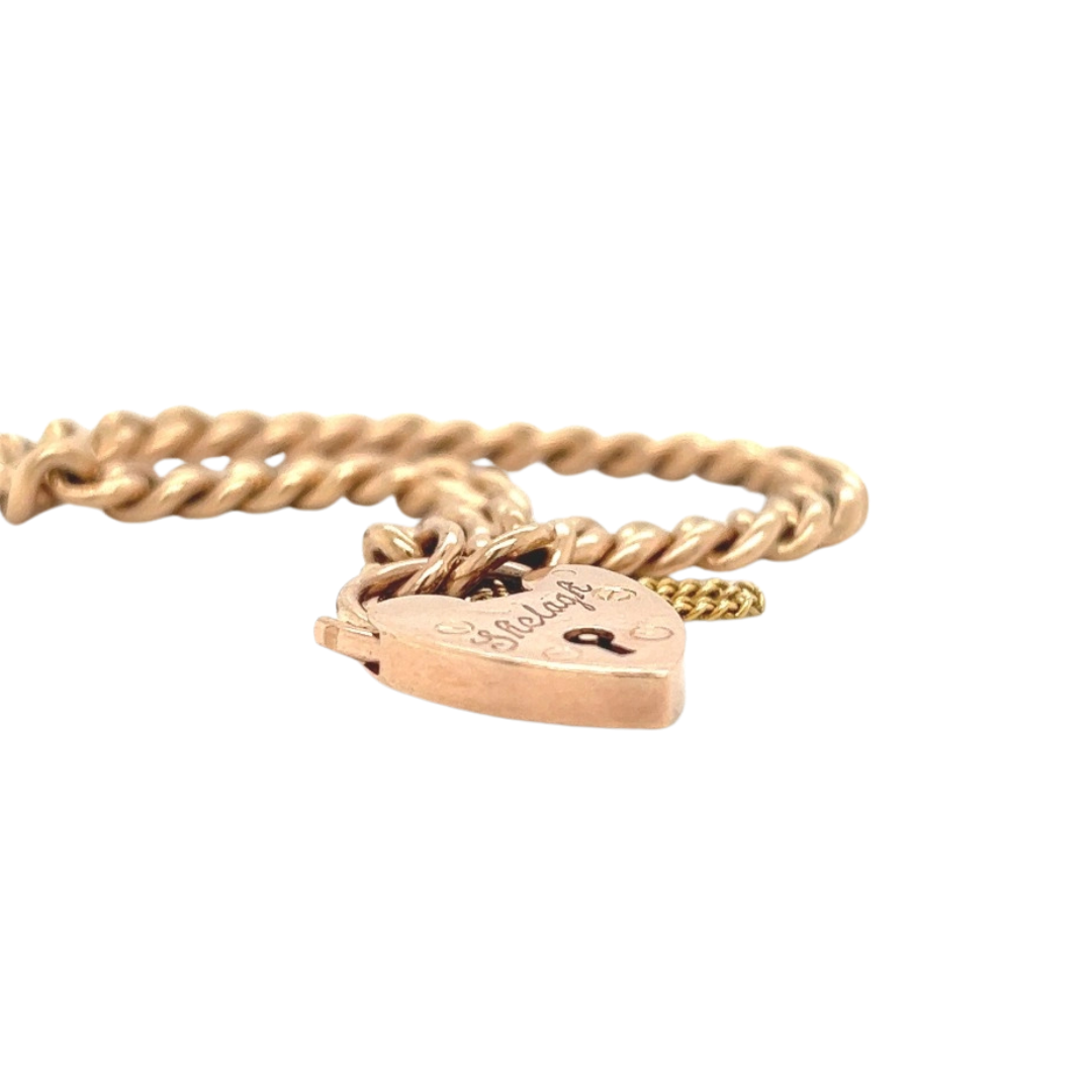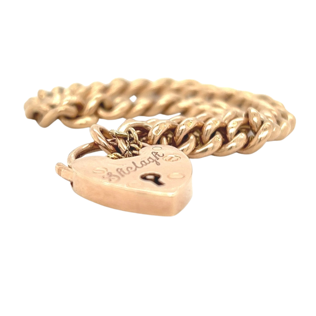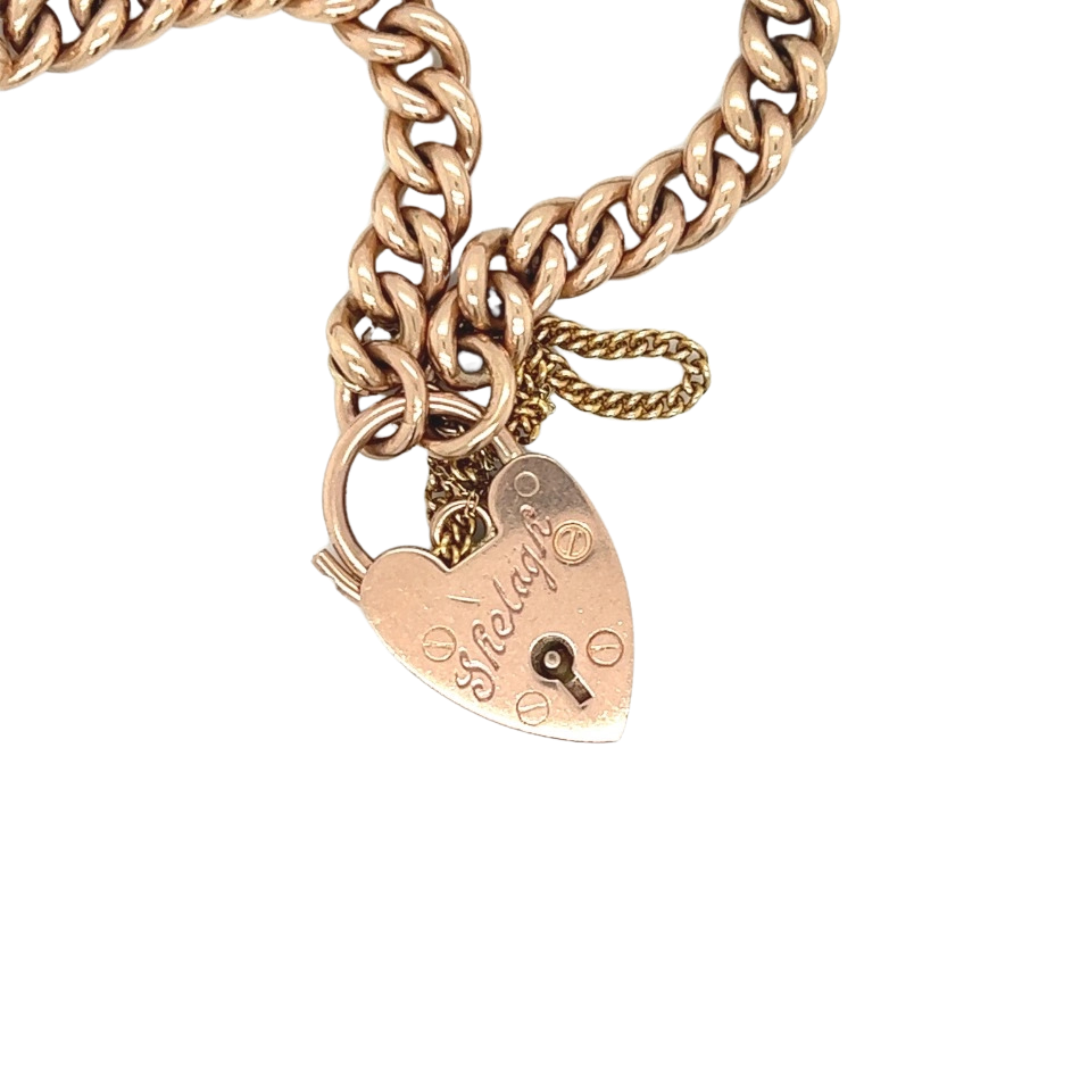 Edwardian 9ct Rose Gold Solid Curb Link Bracelet Hallmarked Ch 1912 Shelagh engraved on padlock