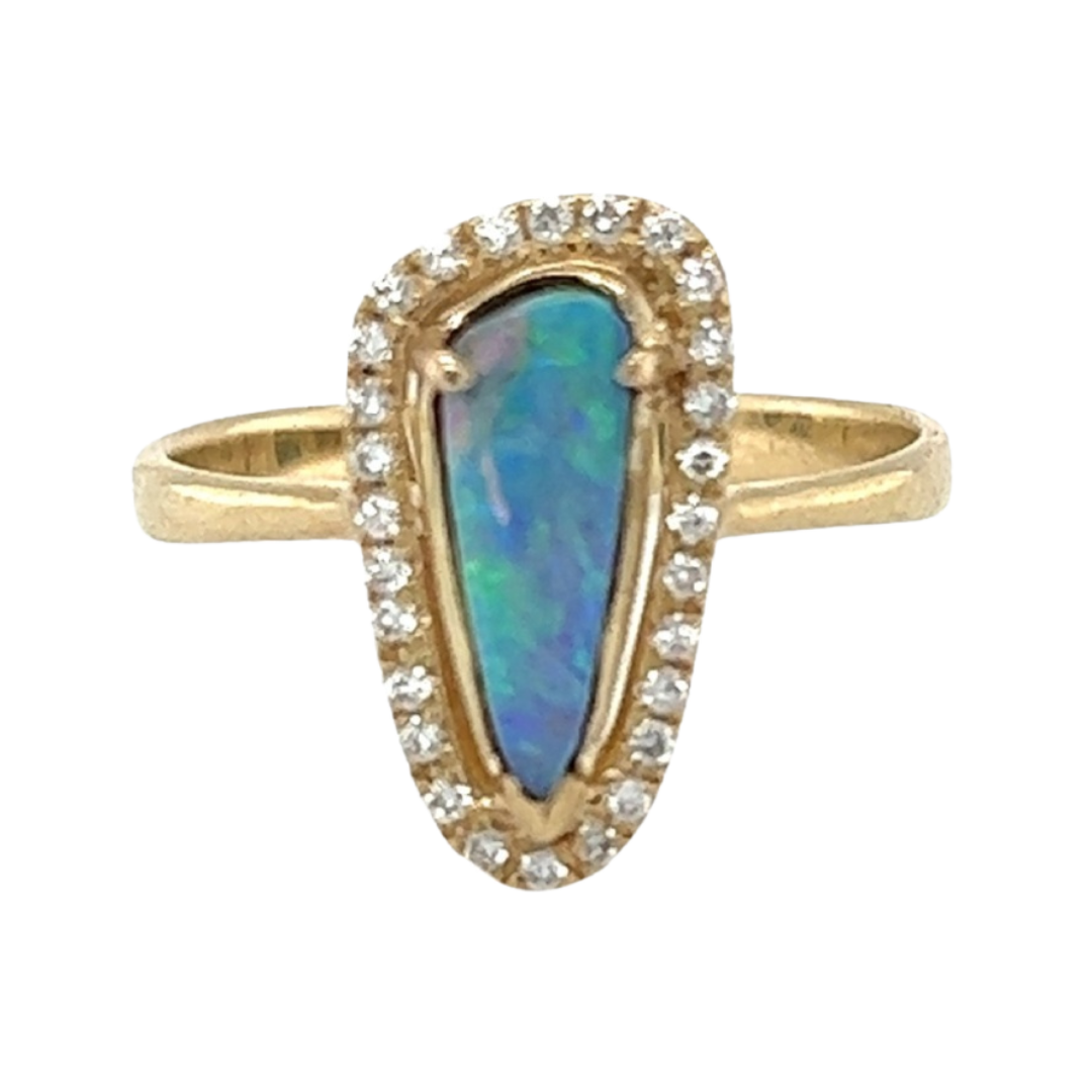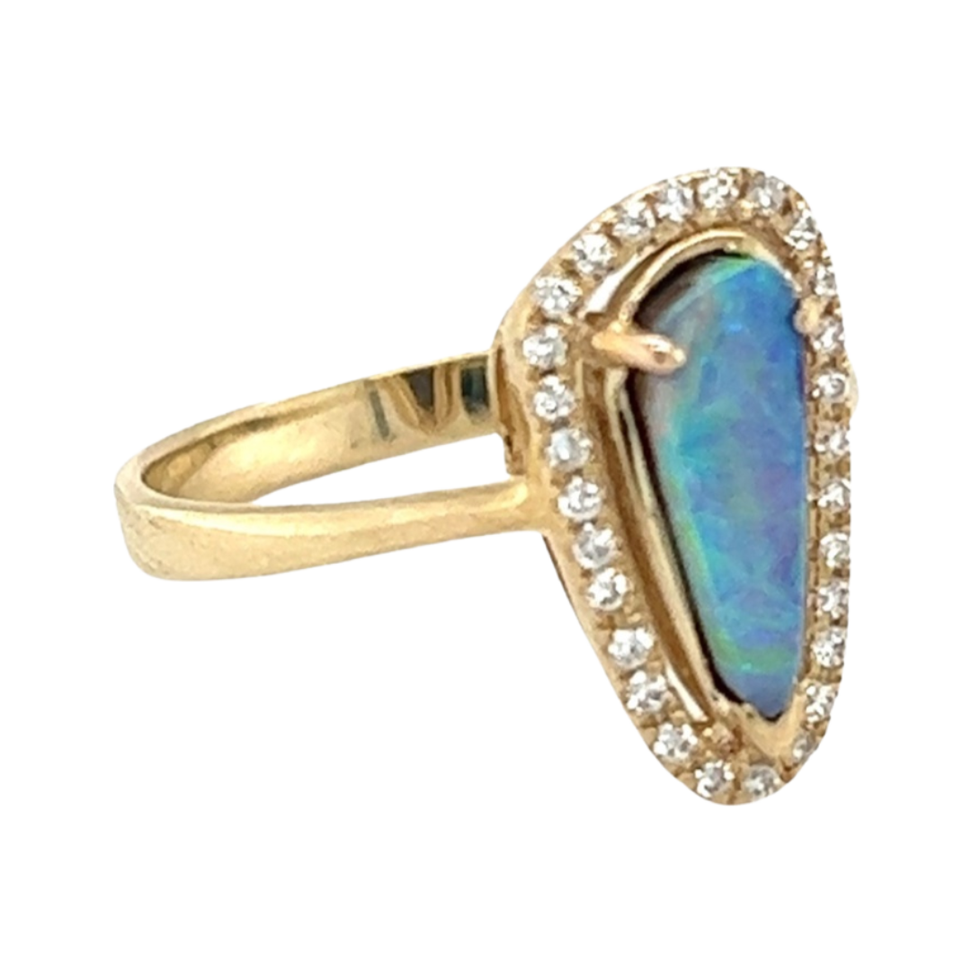 9ct Yellow Gold Elongated Solid Bolder Opal and Diamond Surround Ring