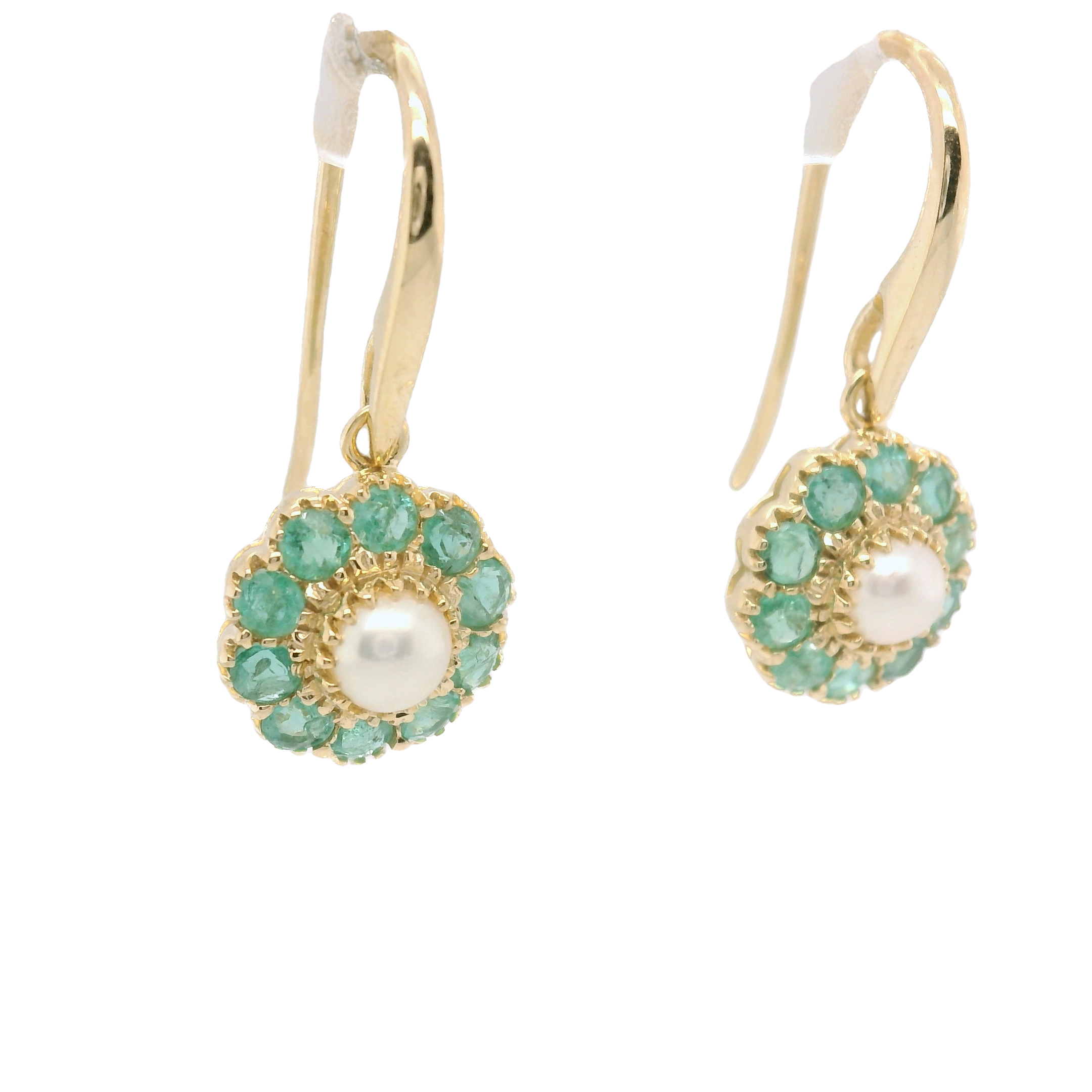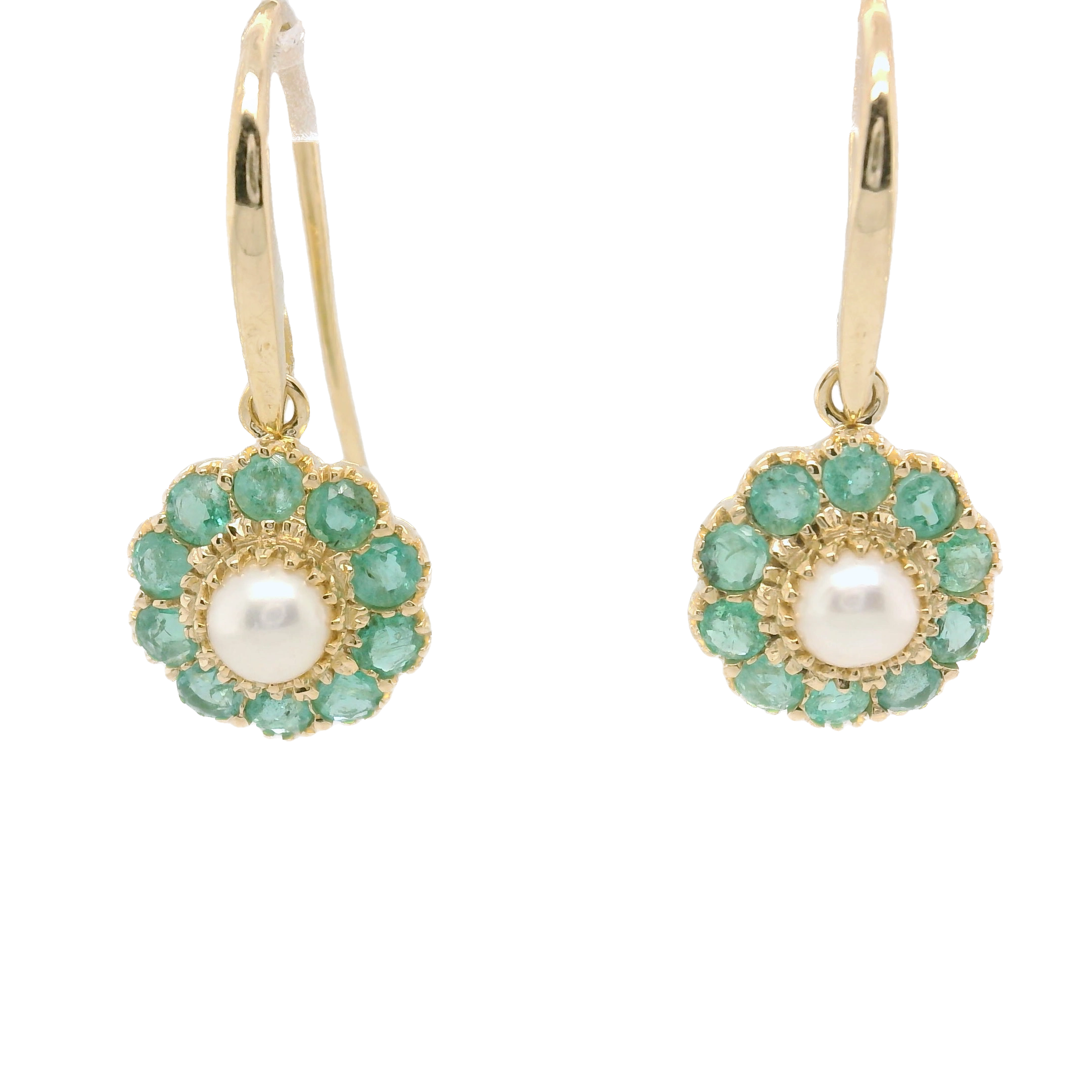 These enchanting 9ct yellow gold emerald and pearl flower earrings showcase a delightful fusion of vibrant color and classic elegance. The rich green emeralds, known for their captivating hue and symbolism of love and rebirth, form the petals of the floral design, radiating a sense of freshness and vitality. Nestled at the center of each flower is a lustrous pearl, adding a soft, iridescent glow that beautifully complements the emeralds. Crafted in warm yellow gold, these earrings not only highlight the exquisite gemstones but also ensure durability and comfort for everyday wear. Perfect for both casual outings and special occasions, these earrings embody a timeless charm, making them a lovely addition to any jewellery collection.