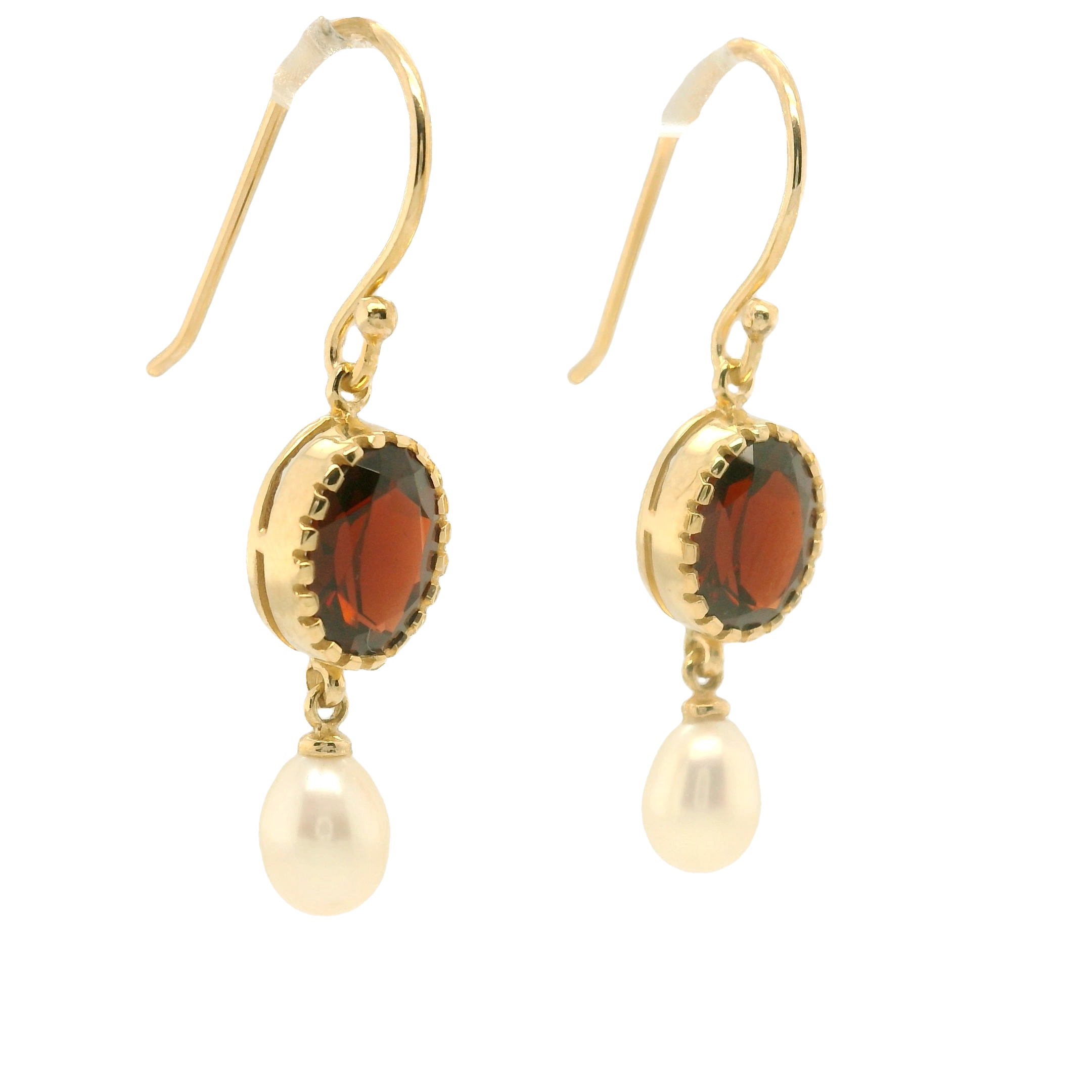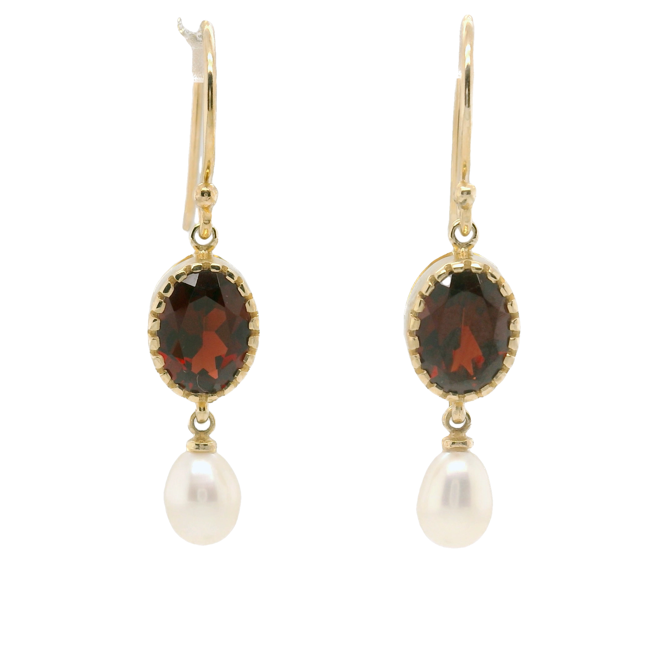 Elegant 9ct Yellow Gold Garnet & Pearl Drop Earrings, a beautiful accessory to any outfit.