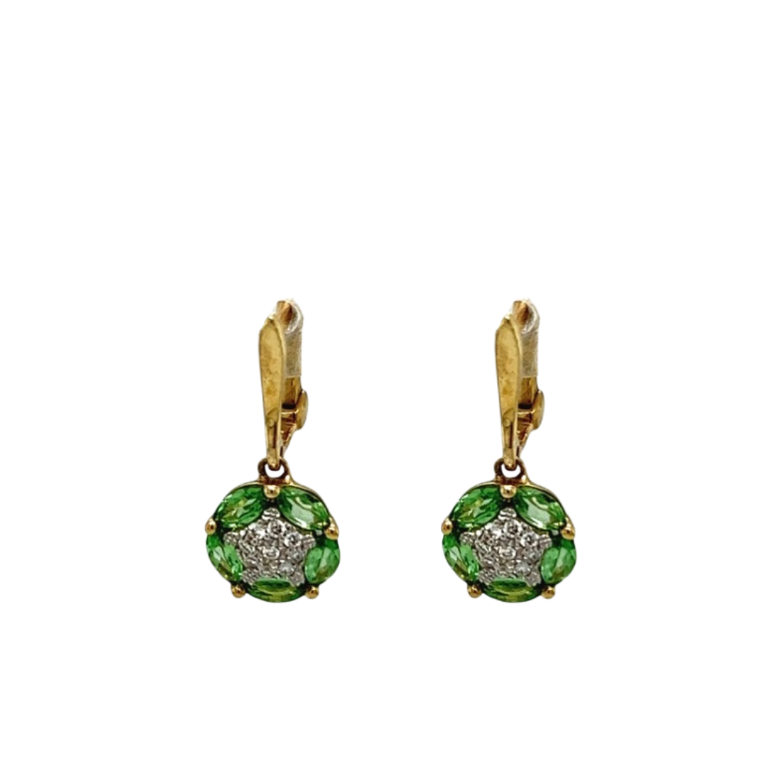 The beautifully intricate 9ct Yellow Gold Green Tsavorite Garnet and Diamond Drop Earrings would make a perfect pair of earrings for any occasion.
