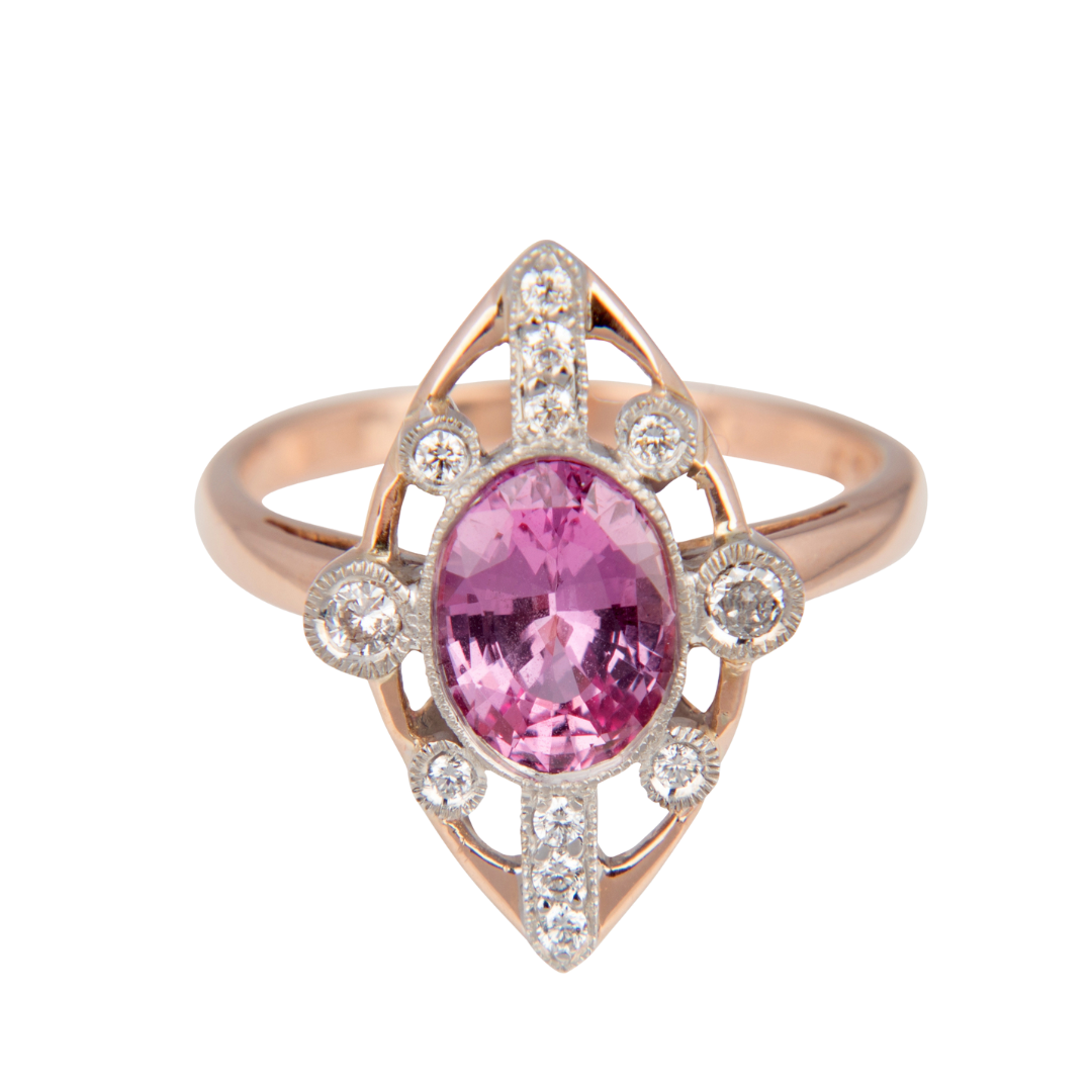Handmade for Avenue J Jewellery 18ct Rose and White Gold Oval Pink Sapphire and Diamond Deco Style Ring