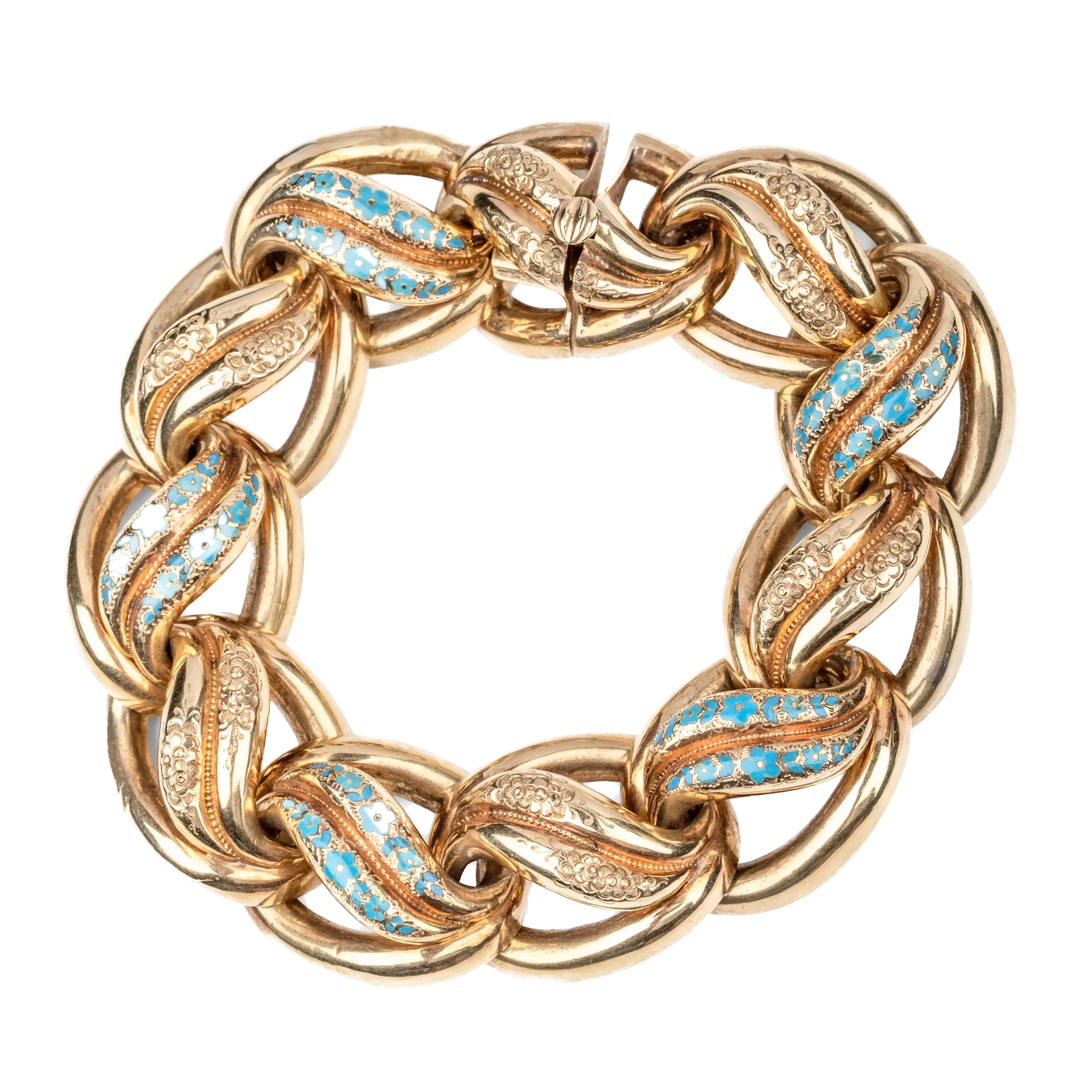 The enamelled Forget Me Nots featured and floral embossed sections are on large alternating double curb links. The bracelet was made circa 1860.
