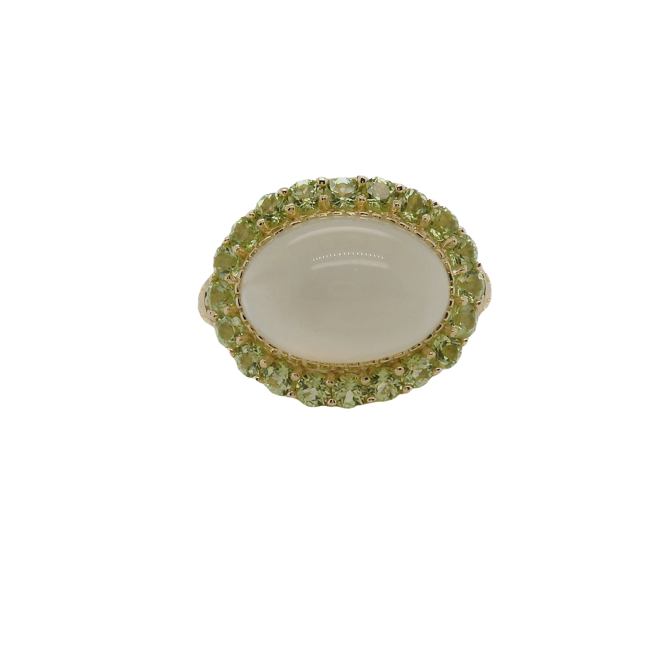 The beautiful 9ct Yellow Gold Peridot and Oval Cabochon Moonstone Ring would look fabulous on any hand, come and try it on today.