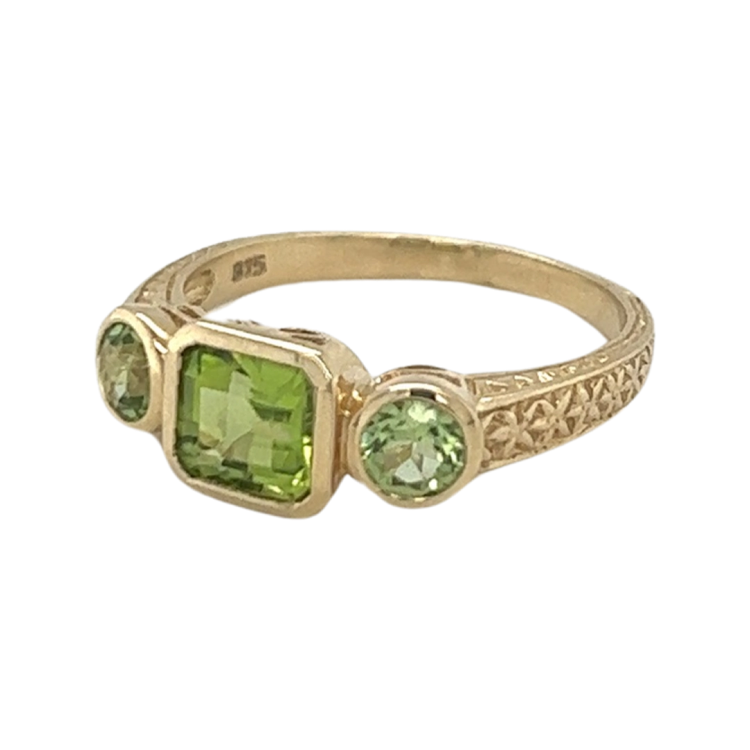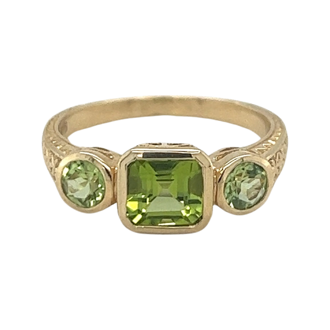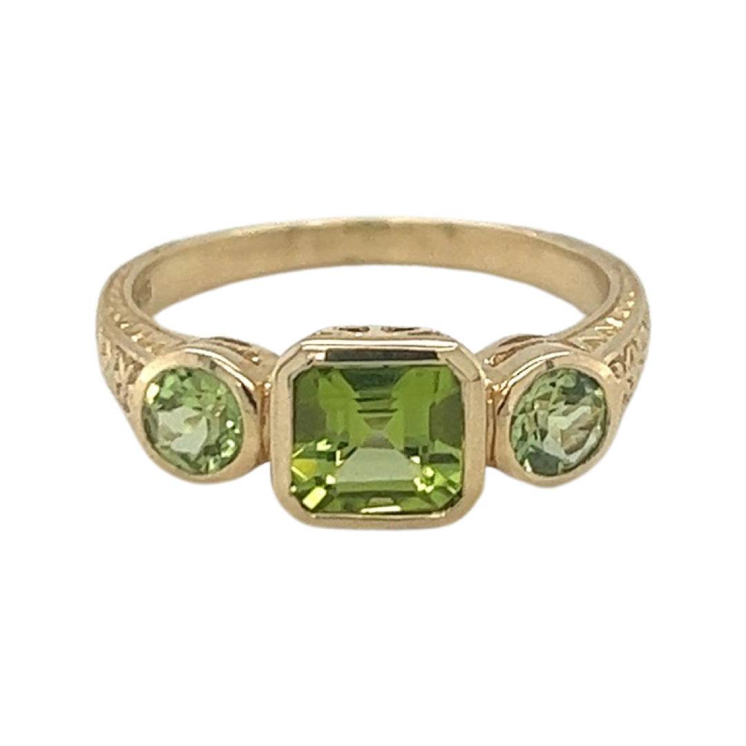 Our 9ct Yellow Gold 1x Emerald cut 2 x round cut Peridot Bezel Set Ring would look stunning on any hand, come in and try this treasure on today.