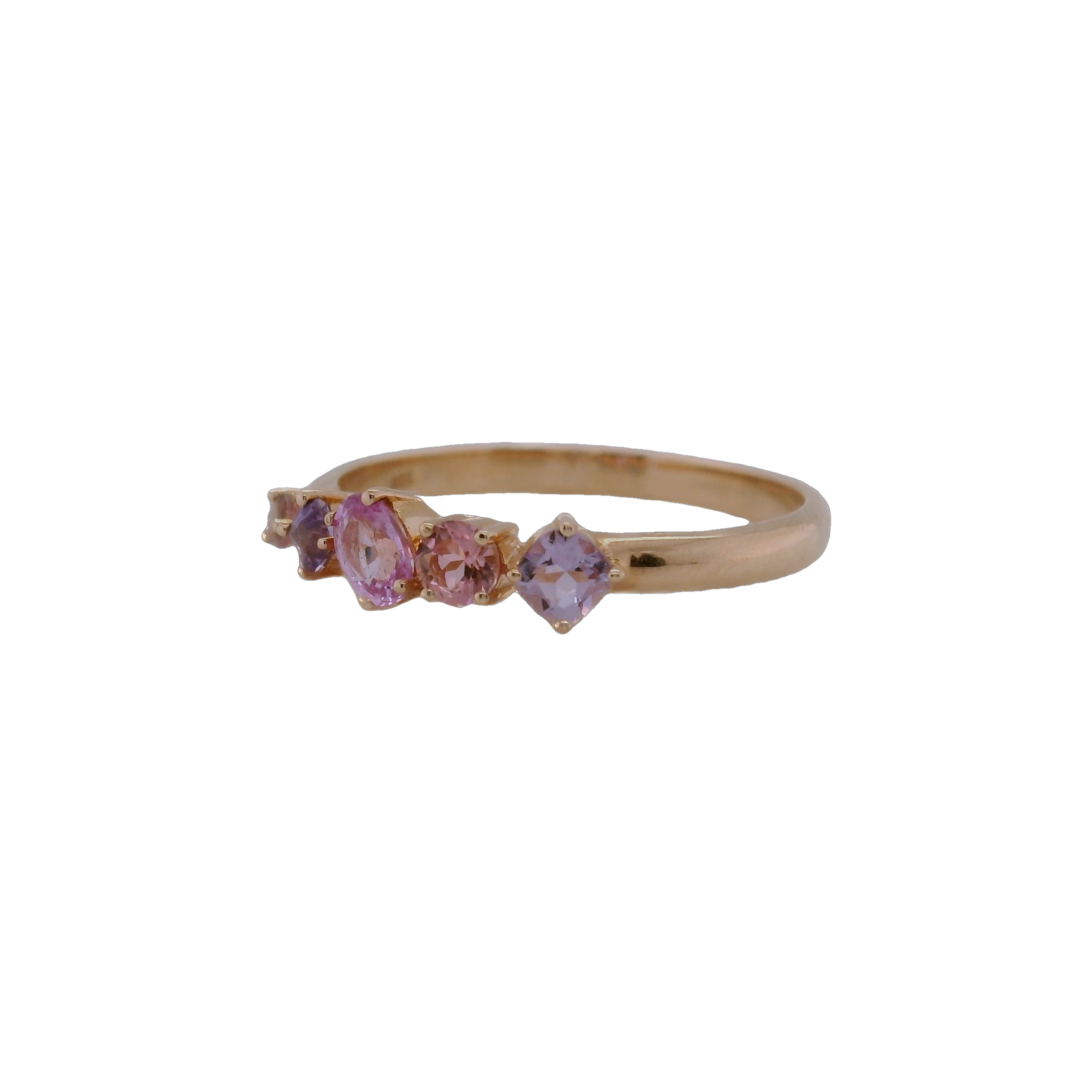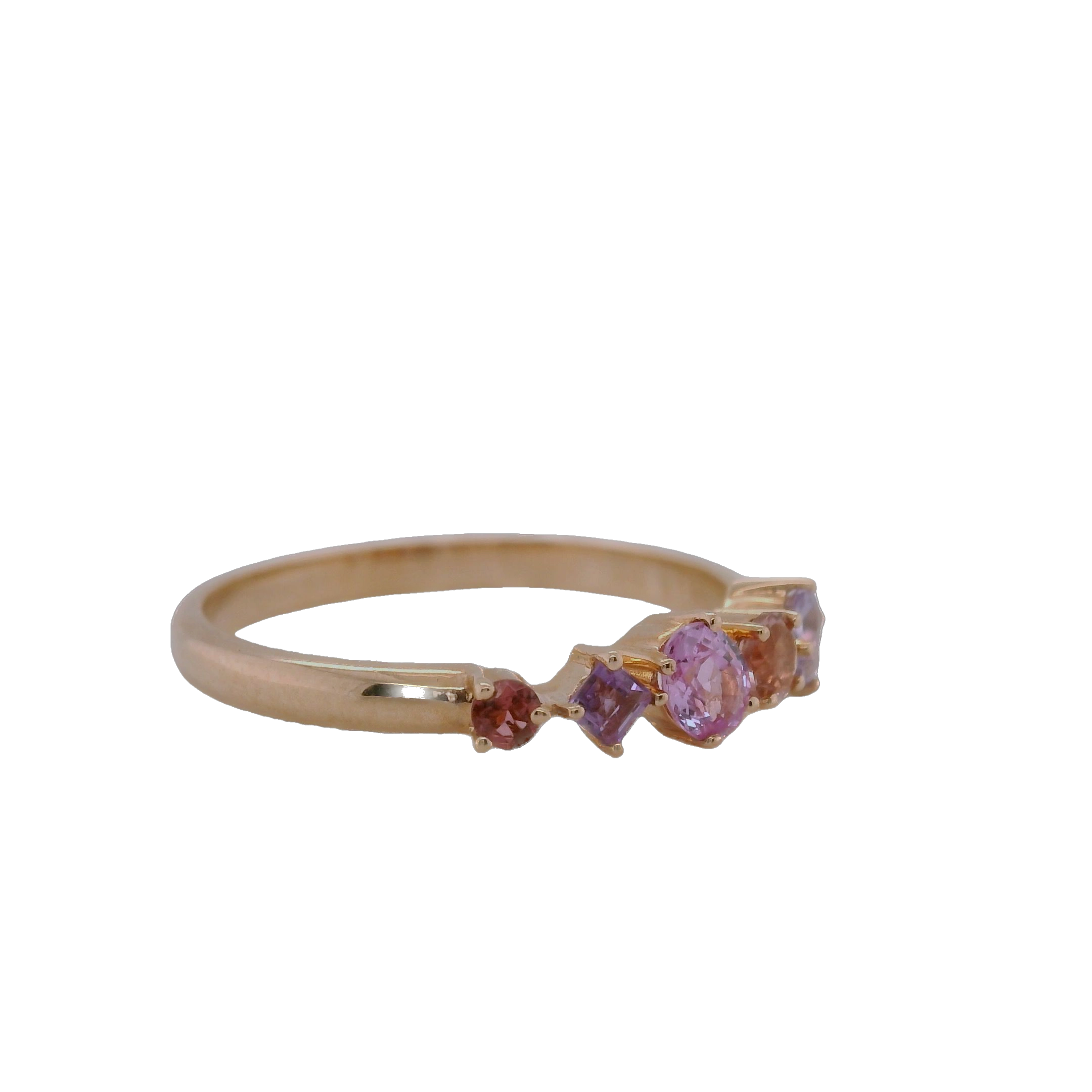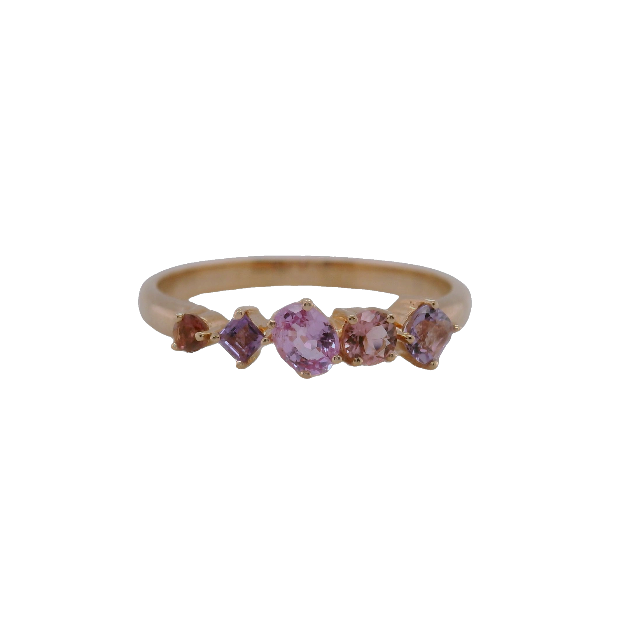 This 9ct Rose Gold Pink Amethyst, Pink Tourmaline, Pink Sapphire, and Amethyst Ring is a celebration of femininity and elegance. Its harmonious palette of soft pinks and deep purples creates a captivating display, exuding a romantic and sophisticated charm. At the heart of the design lies a luminous pink amethyst, its delicate blush hue radiating warmth and grace. Accentuating this centrepiece are sparkling pink tourmaline and pink sapphire stones, their vibrant tones adding depth and richness to the composition. Completing the ensemble are amethyst accents, which introduce a regal purple touch to the design.
