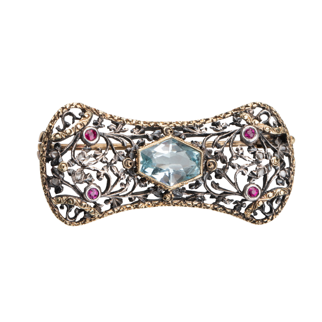 Art Deco 18ct Yellow Gold & Silver Aquamarine, Ruby and Diamond Filigree Brooch