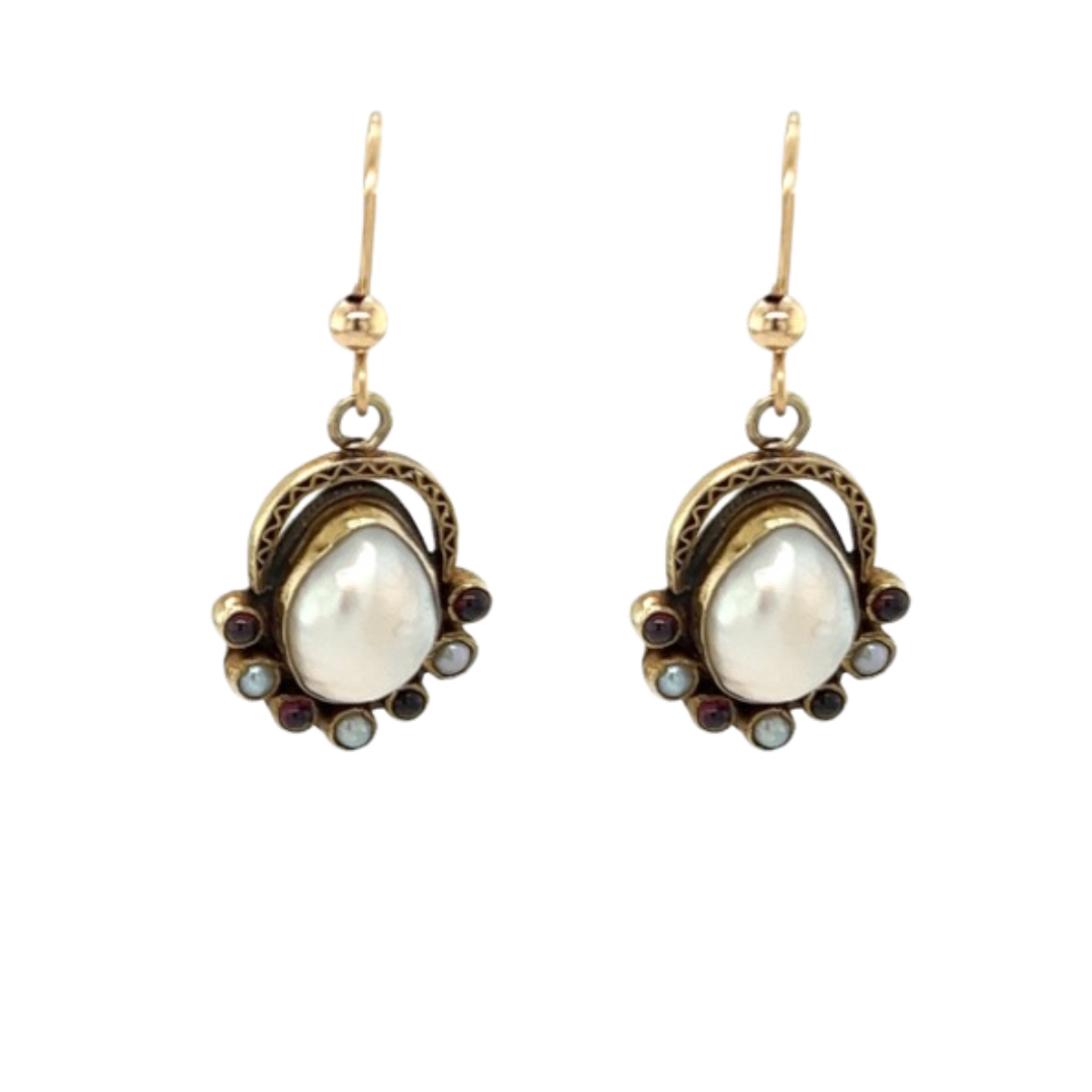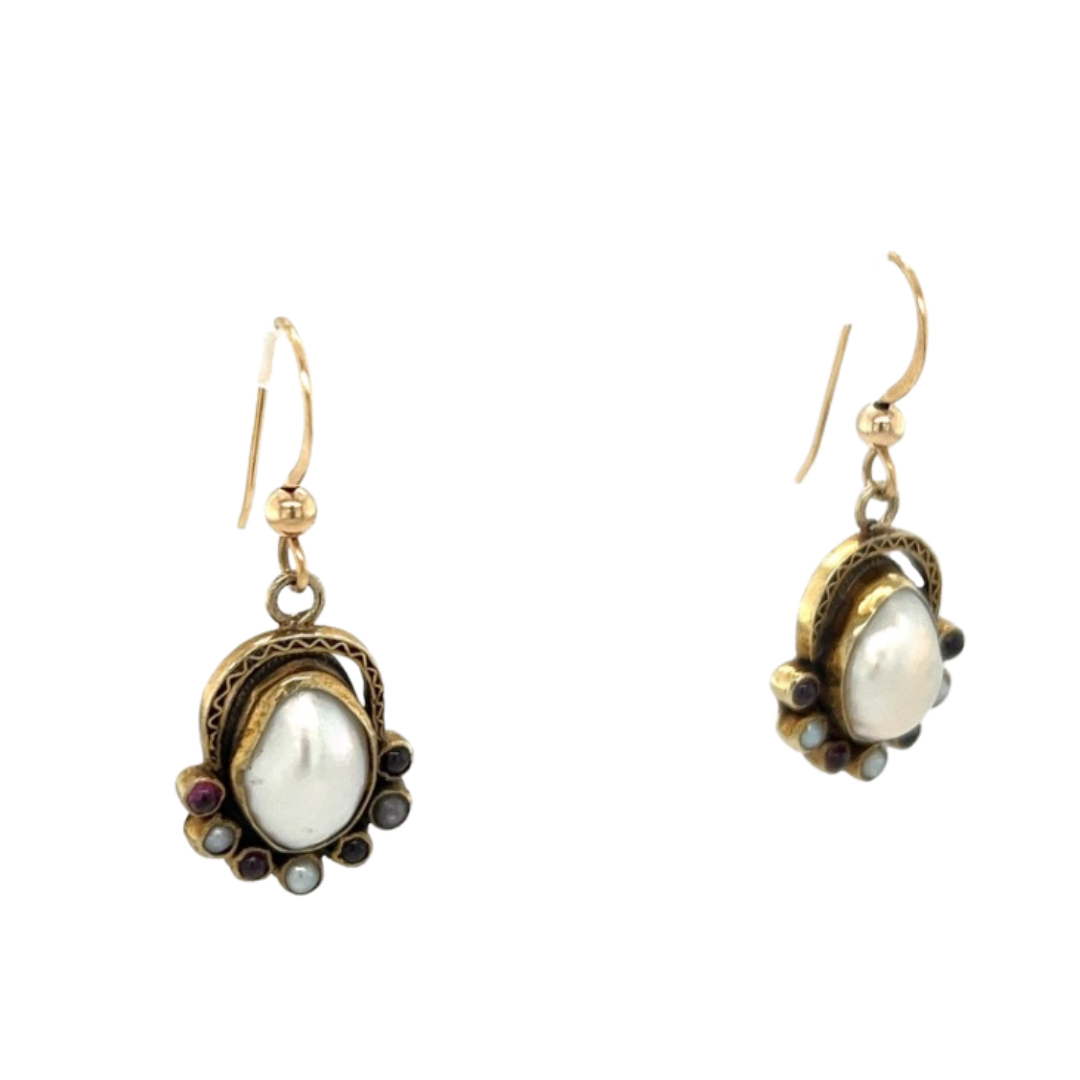 Victorian 14ct Yellow Gold Blister Pearl and Garnet Arts and Crafts Hook Earrings