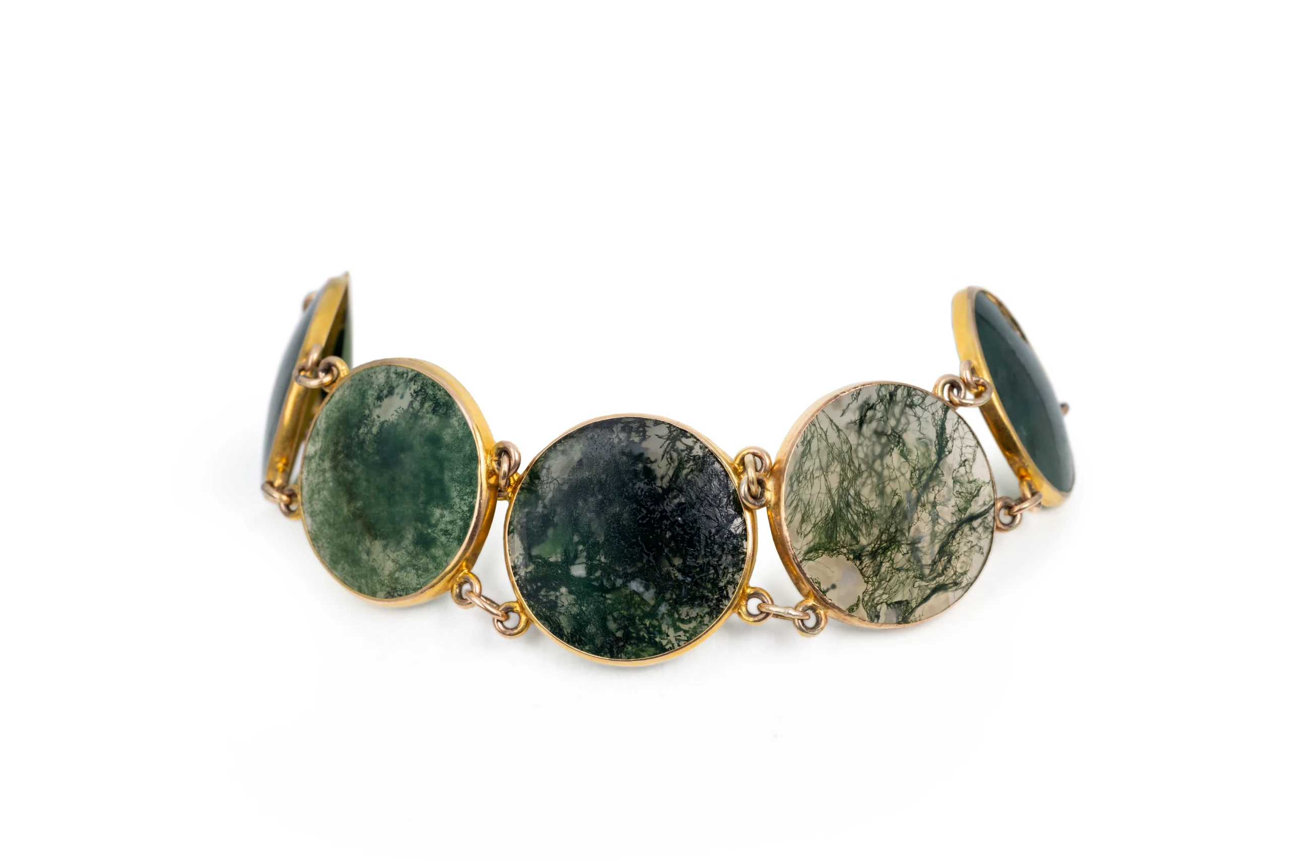 This Victorian 9ct Gold Moss Agate Bracelet is a striking piece of antique jewellery that combines elegance with natural beauty. Moss agate is a semi-precious gemstone known for its unique patterns resembling moss or lichen, often in shades of green, brown, and white. These patterns are formed by mineral inclusions, which create a mesmerising, organic design within the stone. The bracelet's 9ct gold setting adds a touch of sophistication, enhancing the natural allure of the moss agate stones. What sets this bracelet apart is its vintage Victorian craftsmanship, evident in the delicate goldwork and the careful selection of moss agate stones that display intricate patterns. This combination of fine gold and nature’s artwork makes the bracelet both timeless and a truly unique piece for any collection.