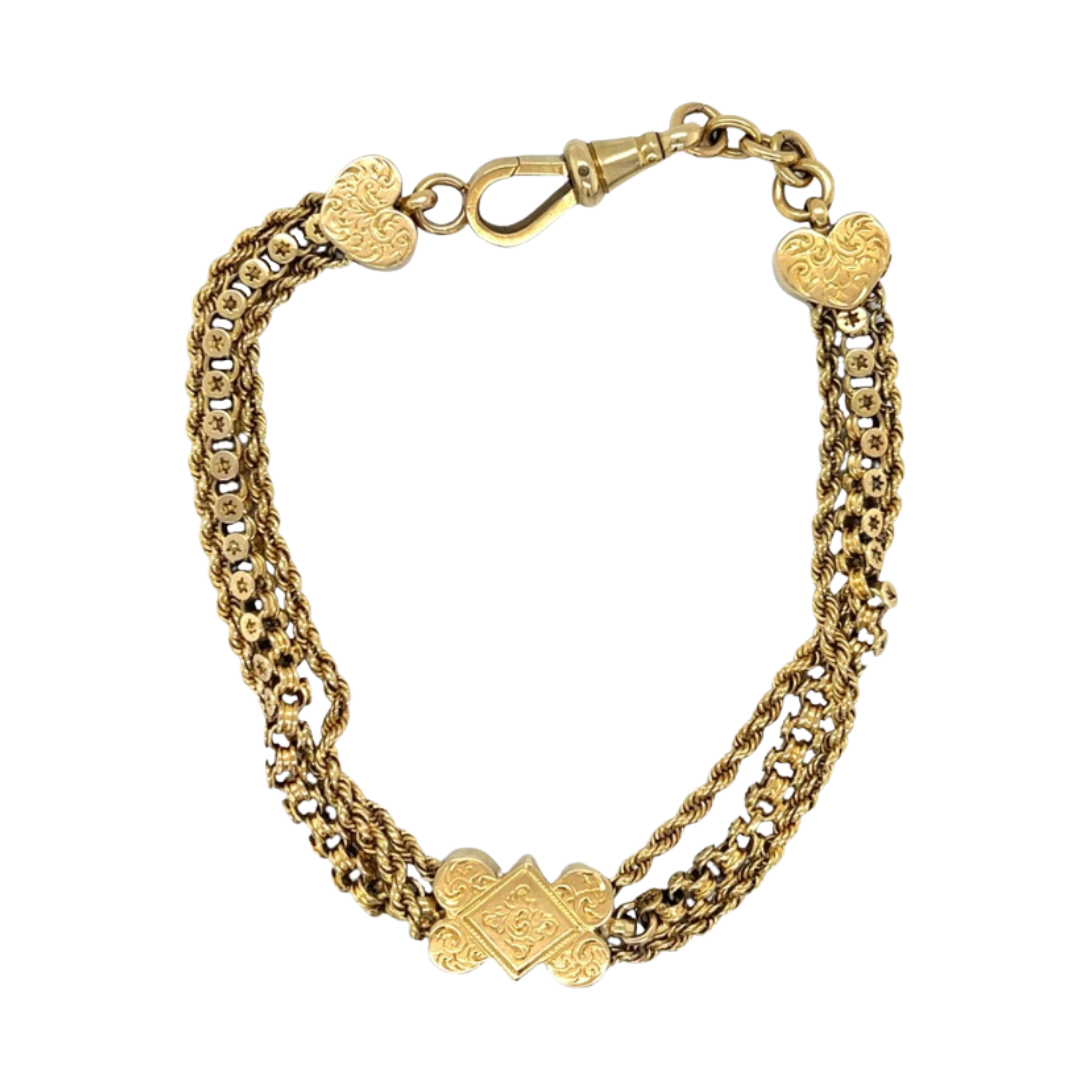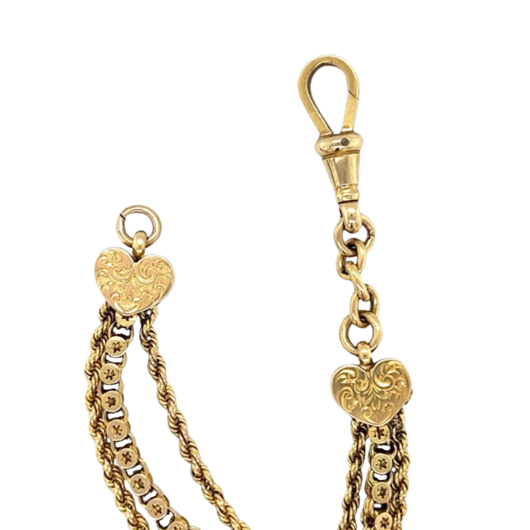 Our Stunning Victorian 9ct Yellow Gold Albertina/Leontine Bracelet with hearts on end, is a beautiful piece of history and would stunning on any wrist.