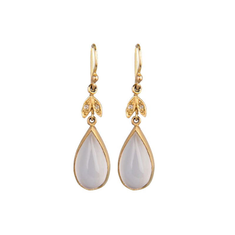 Victorian 9ct Yellow Gold Moonstone Teardrop Earrings with Diamond Set Leaves