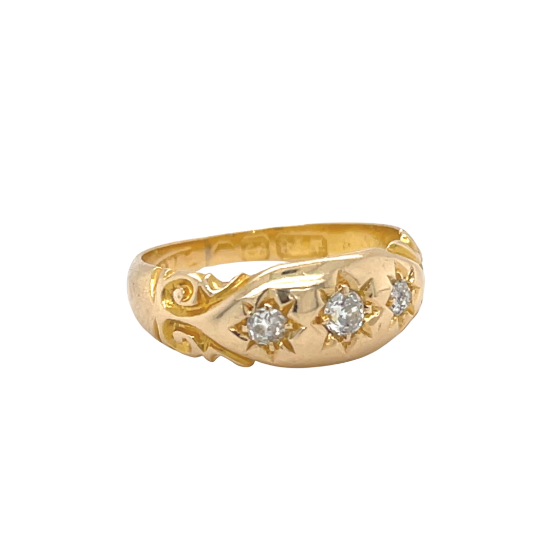Victorian Handmade 18ct Yellow Gold 3 Old Mine Cut Diamond Gypsy set Ring.