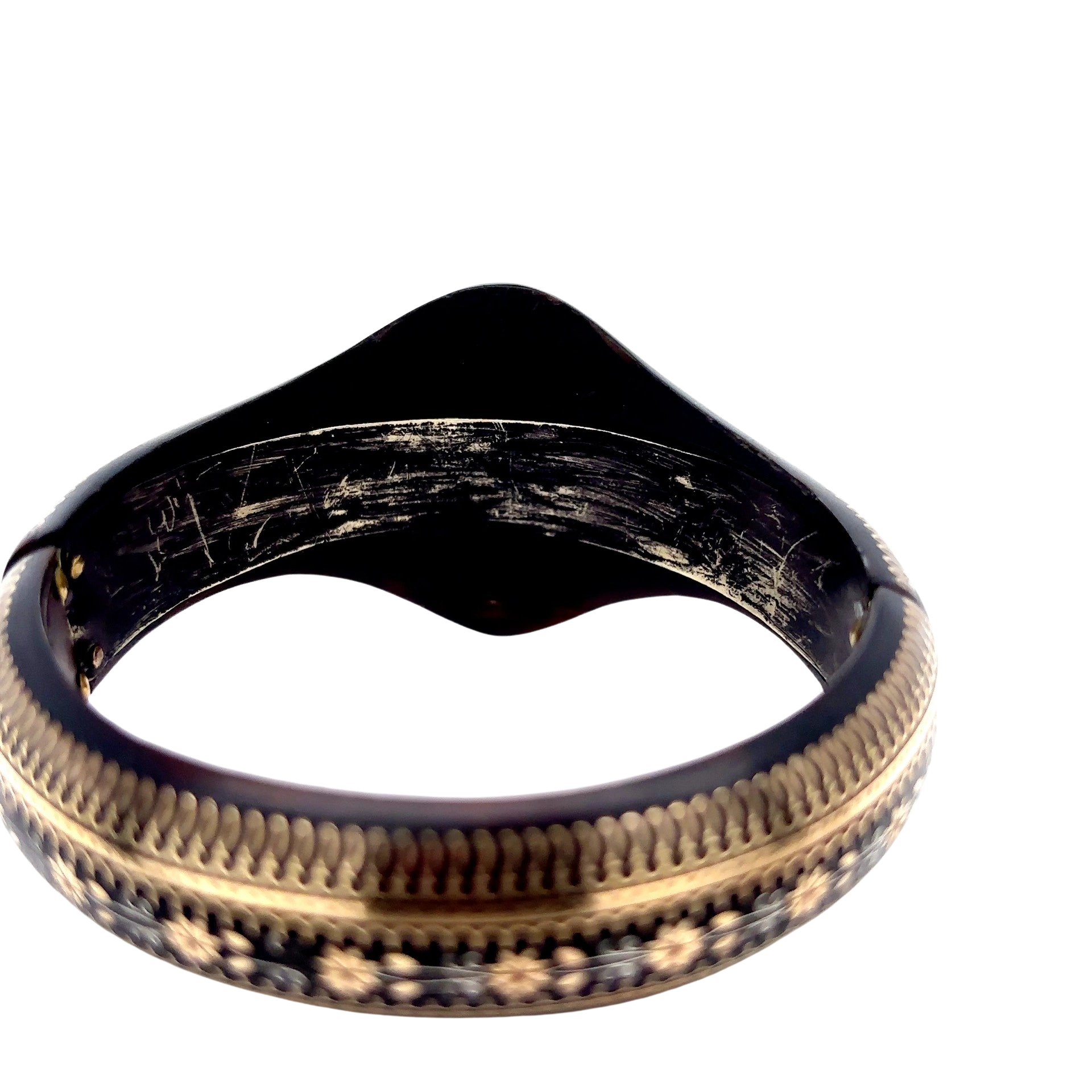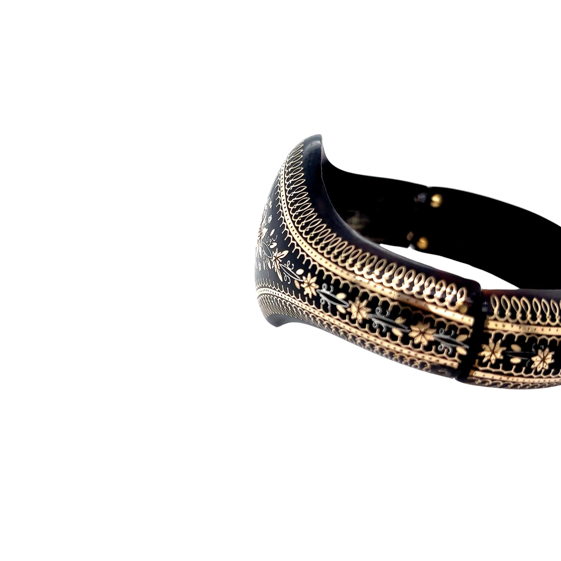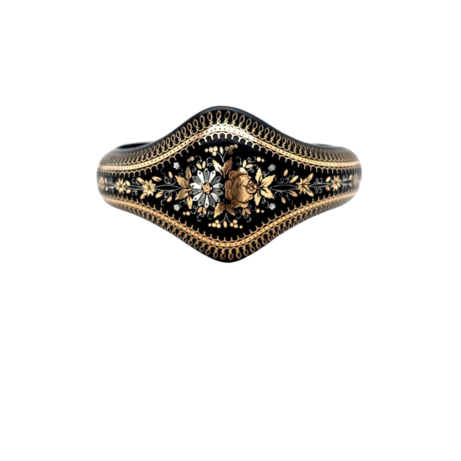 Small metal pieces fill in an engraved design such as floral or scenic. The technique originated in the mid 1600s in Italy and France as decorative objects like boxes it spread to jewellery in the 19th century and reaching its peak in popularity during the Victorian period.