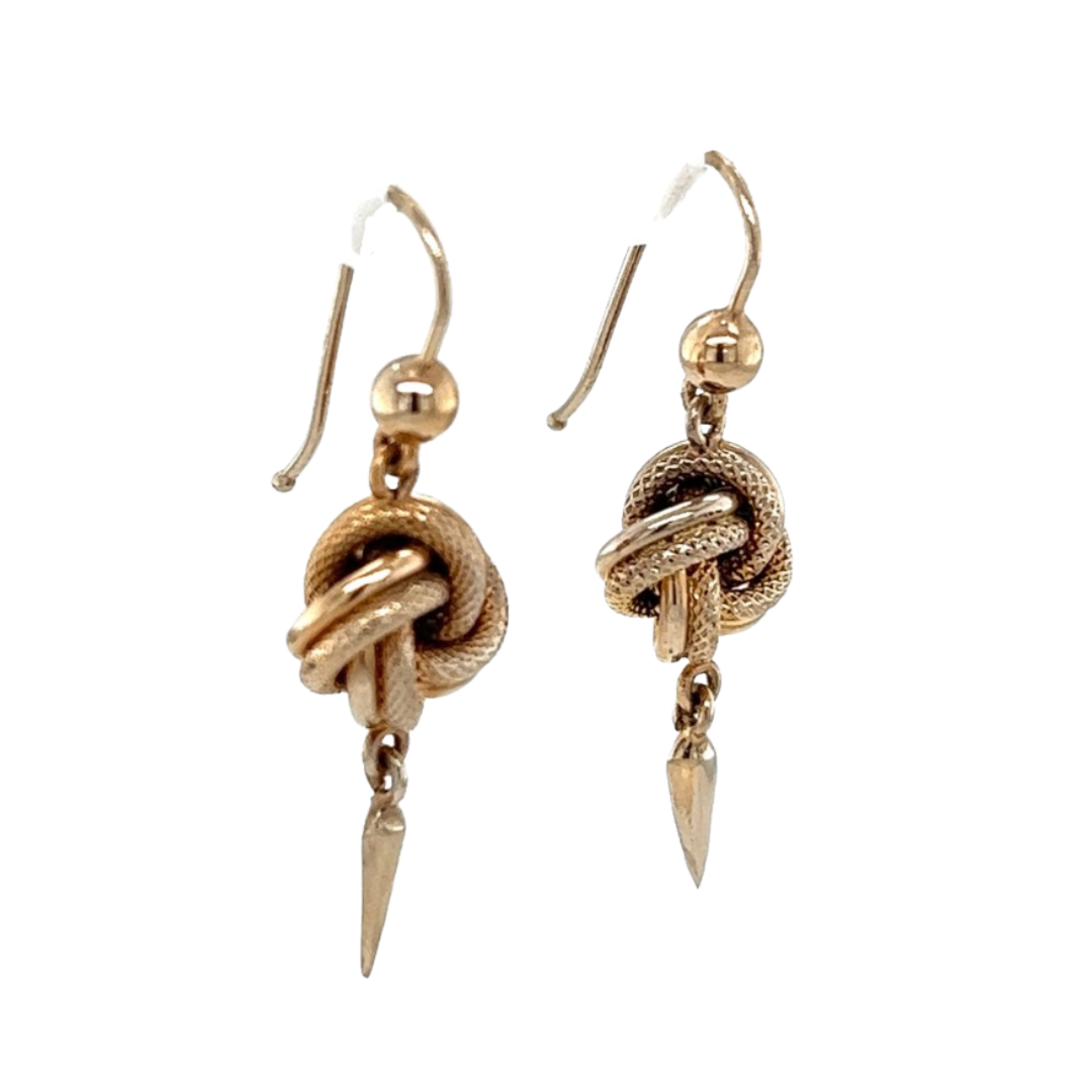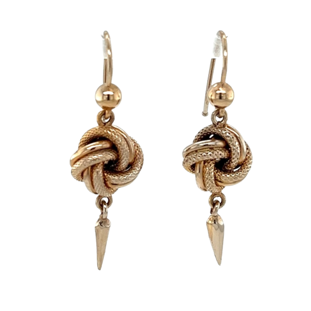 Victorian Unique and collectable 9ct Rose Gold Lovers Knot with ball and an inverted pendulum, Hook Earrings
