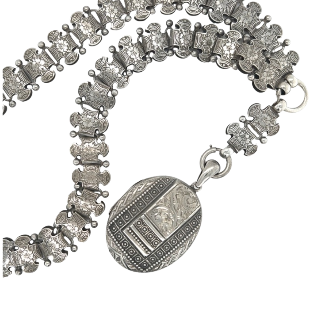 Our delicate Victorian Silver Engraved Locket and Matching Collar is a beautiful and grand piece that would look good on any neck.