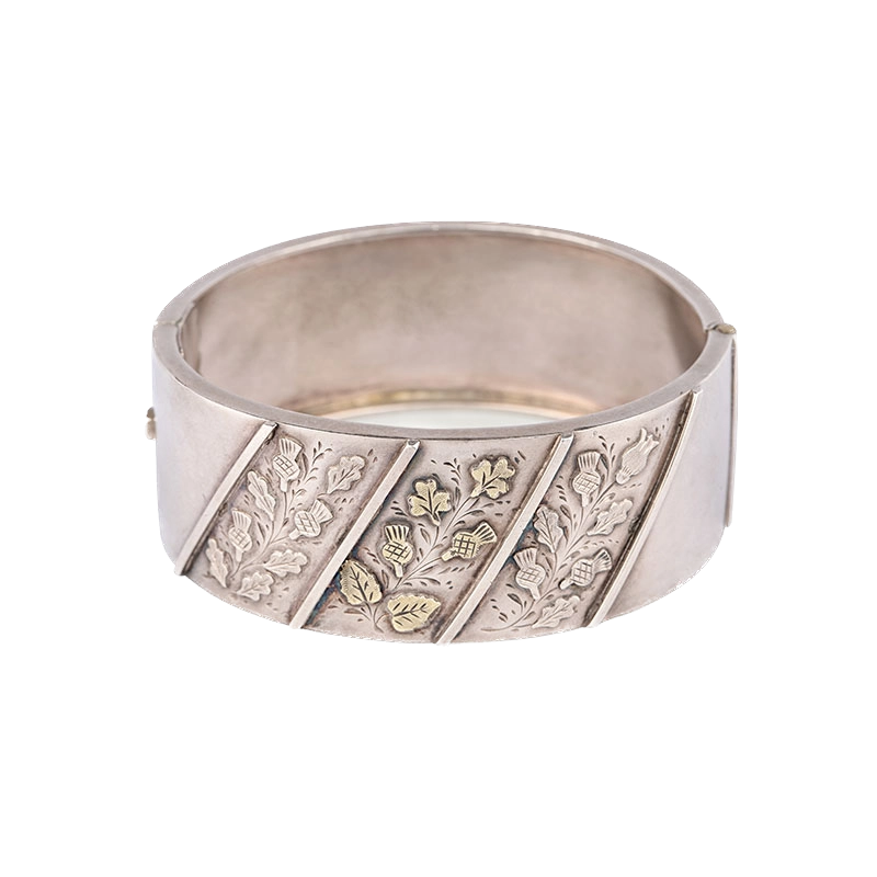 Victorian Sterling Silver & Yellow Gold overlay hinged bangle with thistle detail Birmingham 1896